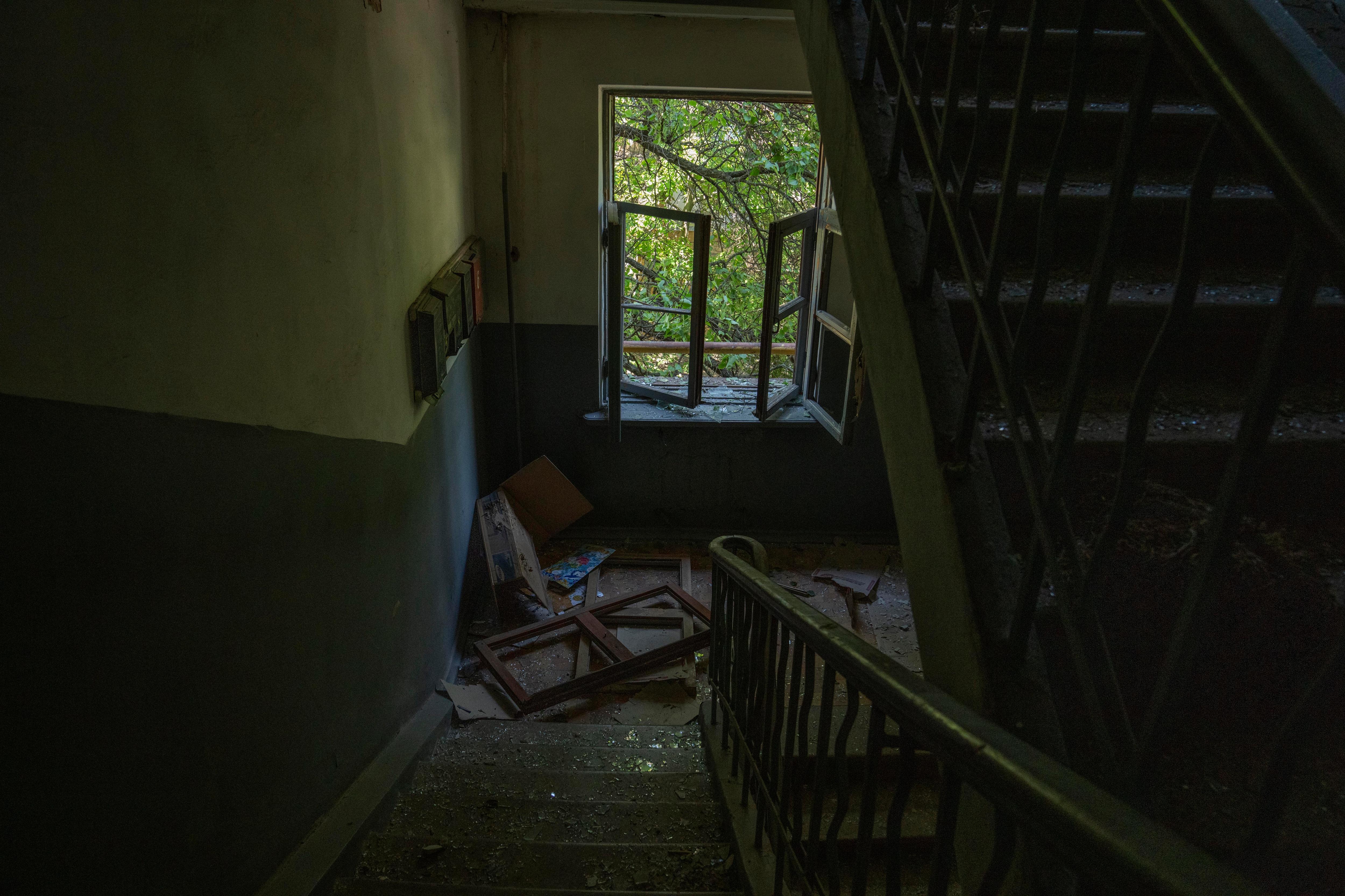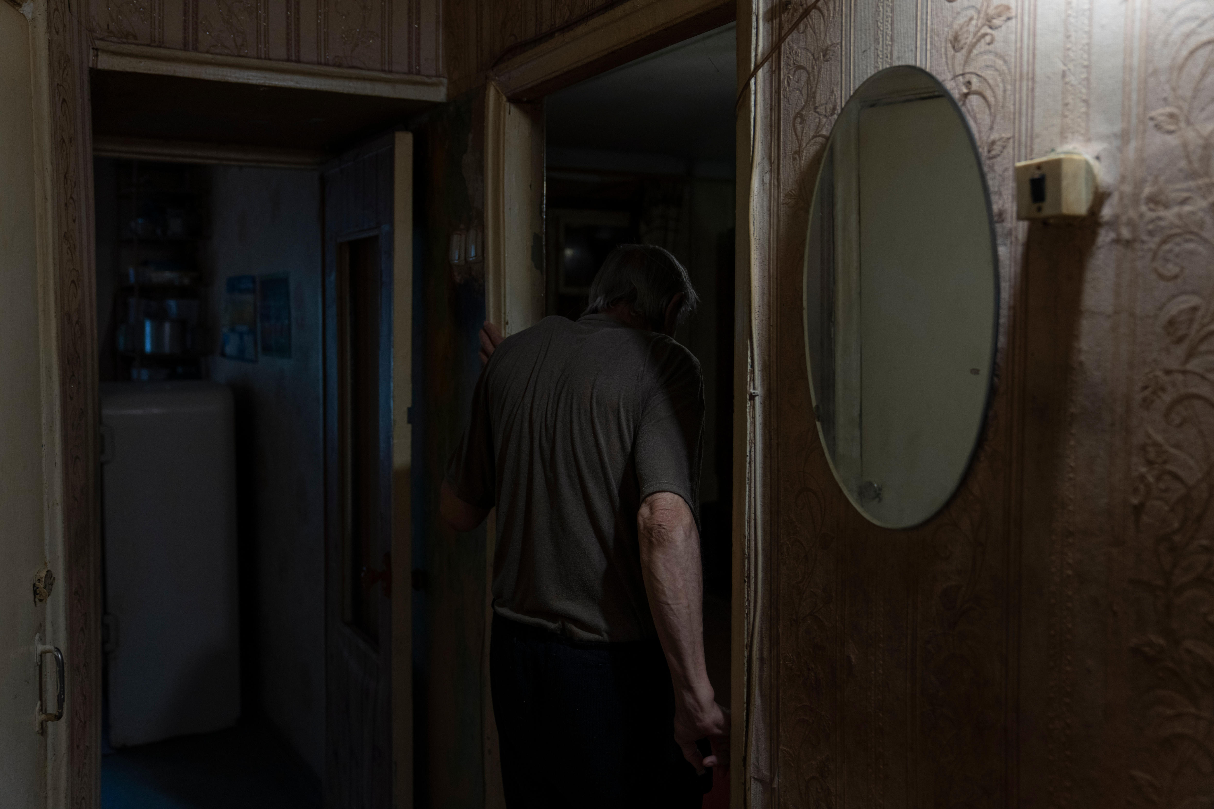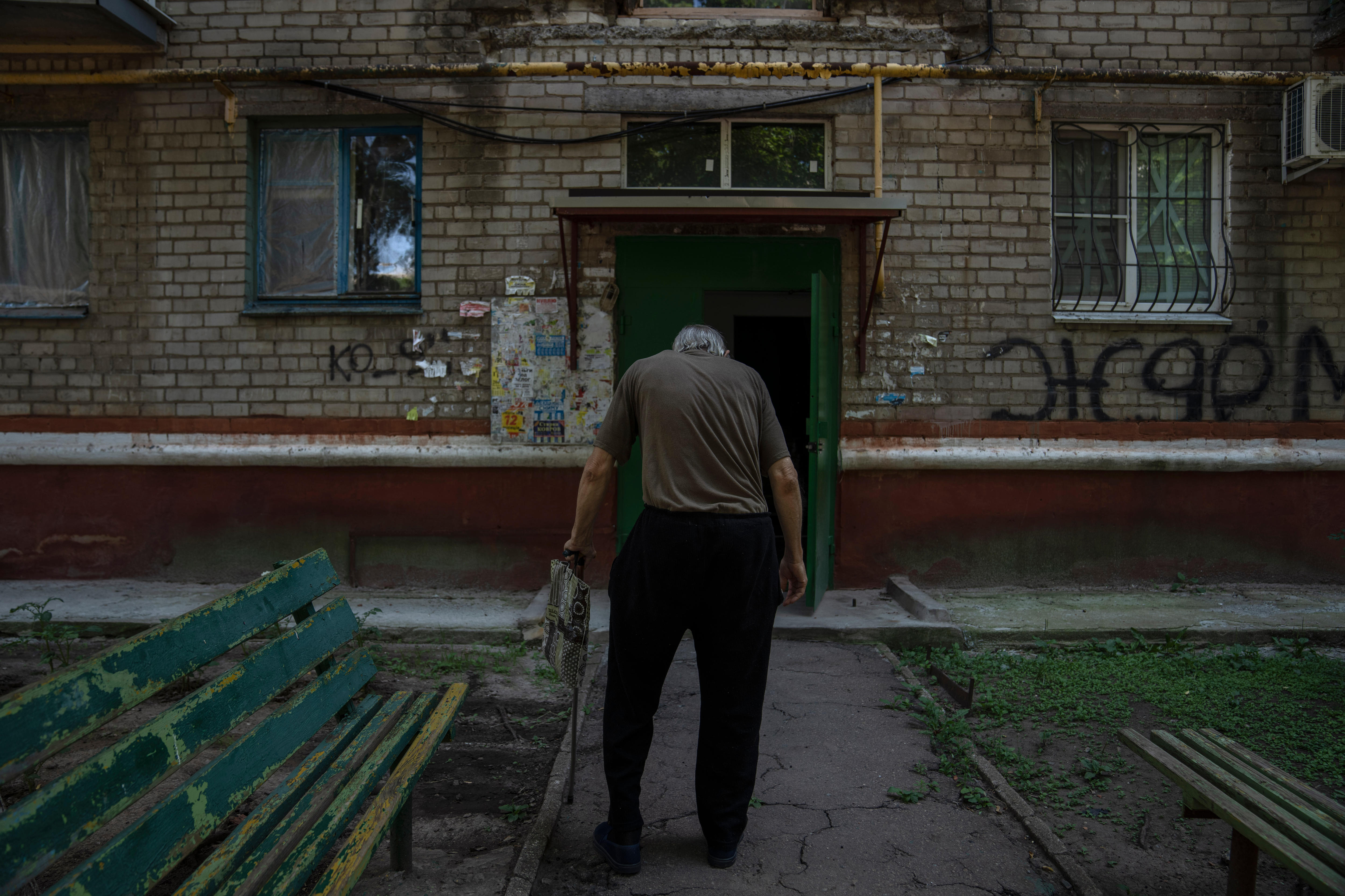 As Ilchenko speaks, his neighbour, also a solo pensioner, gets ready to cook potatoes for lunch on a makeshift outdoor stove since there is no cooking gas in the district. Another woman lives on the building's top floor.