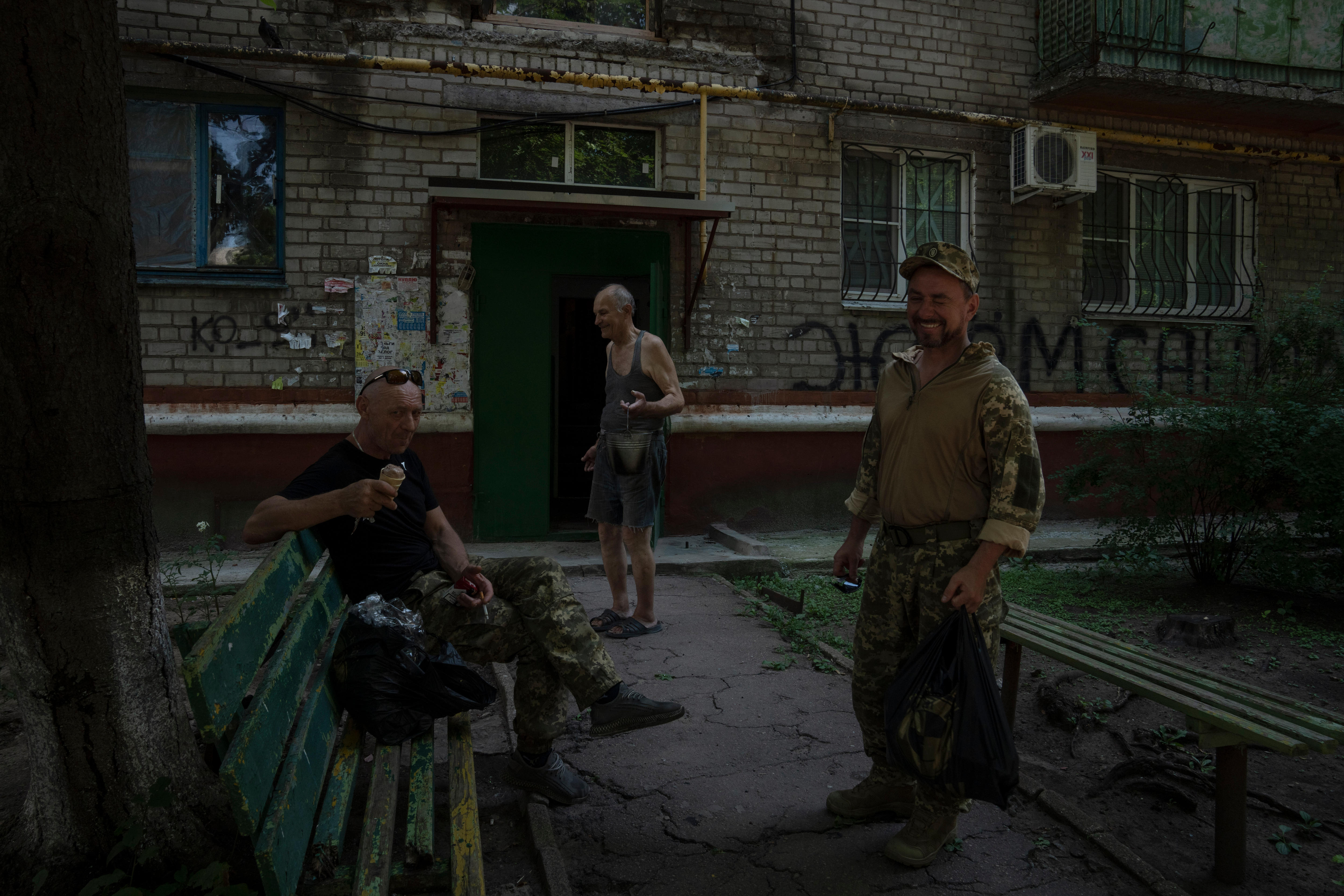 Across the beleaguered city, Valerii Ilchenko sits under the shade of the trees, working on a crossword puzzle.
