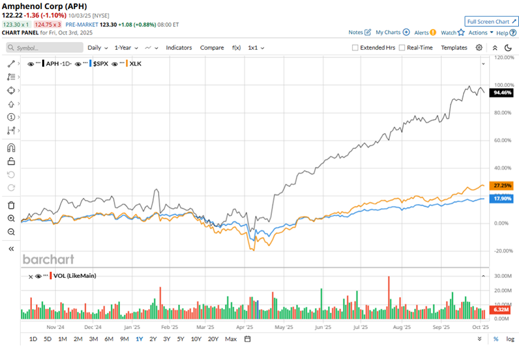 Amphenol shares have soared a stunning 97% over the past year, handily outperforming the broader market and tech peers. For comparison, the broader S&P 500 Index ($SPX) has climbed roughly 17.8% over the same period, while the Technology Select Sector SPDR Fund (XLK) surged an impressive 27.8%.