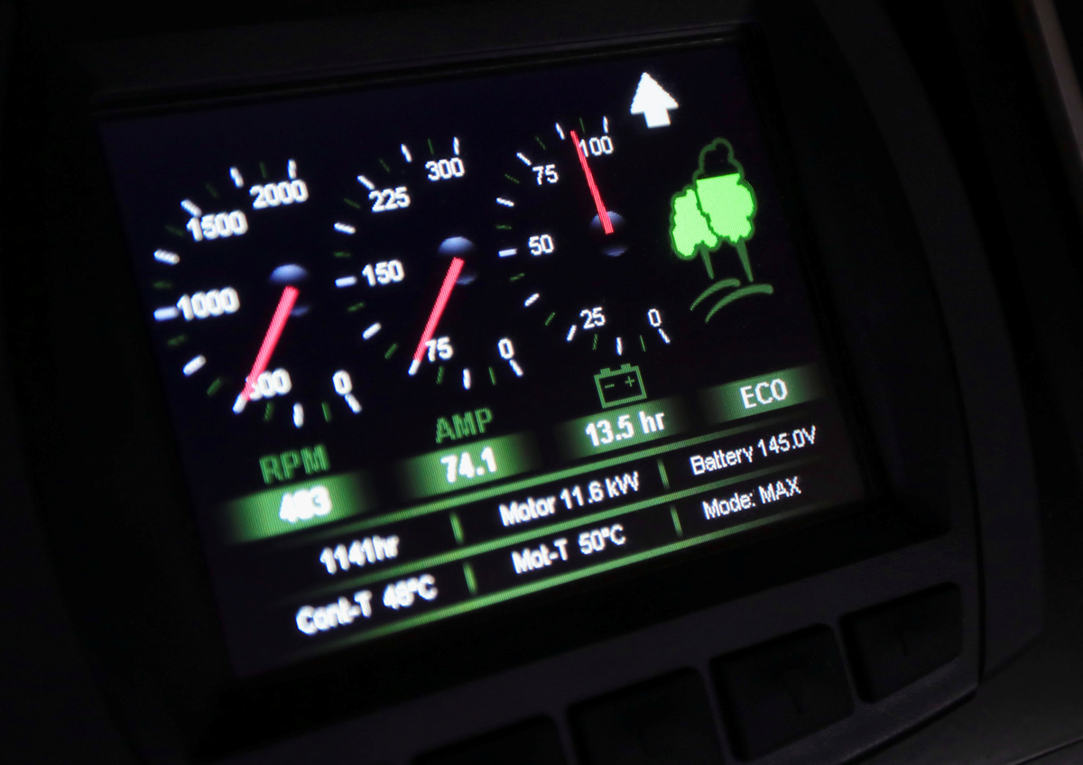 A display panel is seen giving information about the batteries inside the electric canal boat, while CEOs from green energy companies gather to make all canal boats climate neutral in Amsterdam, Netherlands March 2, 2020. REUTERS/Eva Plevier