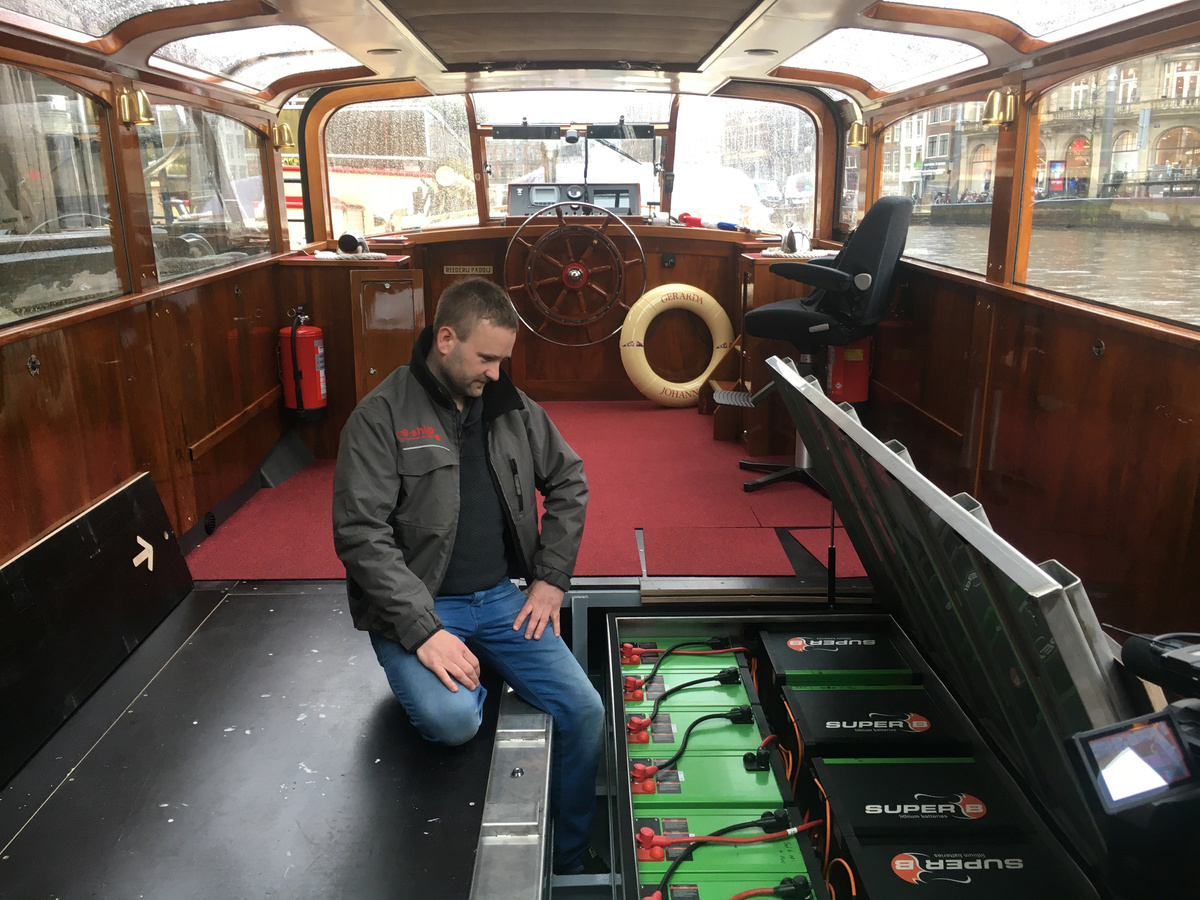 The century-old Amsterdam canal boat Gerarda Johanna looks like a classic with wood paneling, but beneath its floorboards lies a high-tech underbelly: rows of lithium ion batteries, 66 in all, with an electric drive train powering its propeller.