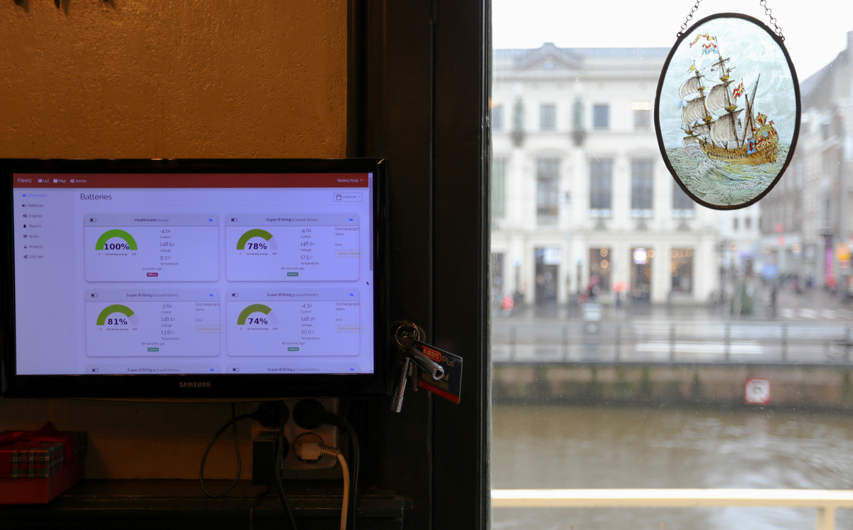 A man is looking at the information panel at the office showing battery and location information of electric boats while CEOs from green energy companies gather to make all canal boats climate neutral in Amsterdam, Netherlands March 2, 2020. REUTERS/Eva PlevierA battery is seen inside the electric canal boat, while CEOs from green energy companies gather to make all canal boats climate neutral in Amsterdam, Netherlands March 2, 2020. REUTERS/Eva PlevierAn electric motor is pictured on a canal boat, while CEOs from green energy companies gather to make all canal boats climate neutral in Amsterdam, Netherlands March 2, 2020. REUTERS/Eva PlevierA man is looking on an application on his phone showing the information about battery and location of electric canal boats while CEOs from green energy companies gather to make all canal boats climate neutral in Amsterdam, Netherlands March 2, 2020. REUTERS/Eva PlevierAn information panel is seen at the office showing battery and location information of electric boats while CEOs from green energy companies gather to make all canal boats climate neutral in Amsterdam, Netherlands March 2, 2020. REUTERS/Eva PlevierAn information panel is seen at the office showing battery and location information of electric boats, while CEOs from green energy companies gather to make all canal boats climate neutral in Amsterdam, Netherlands March 2, 2020. REUTERS/Eva Plevier
