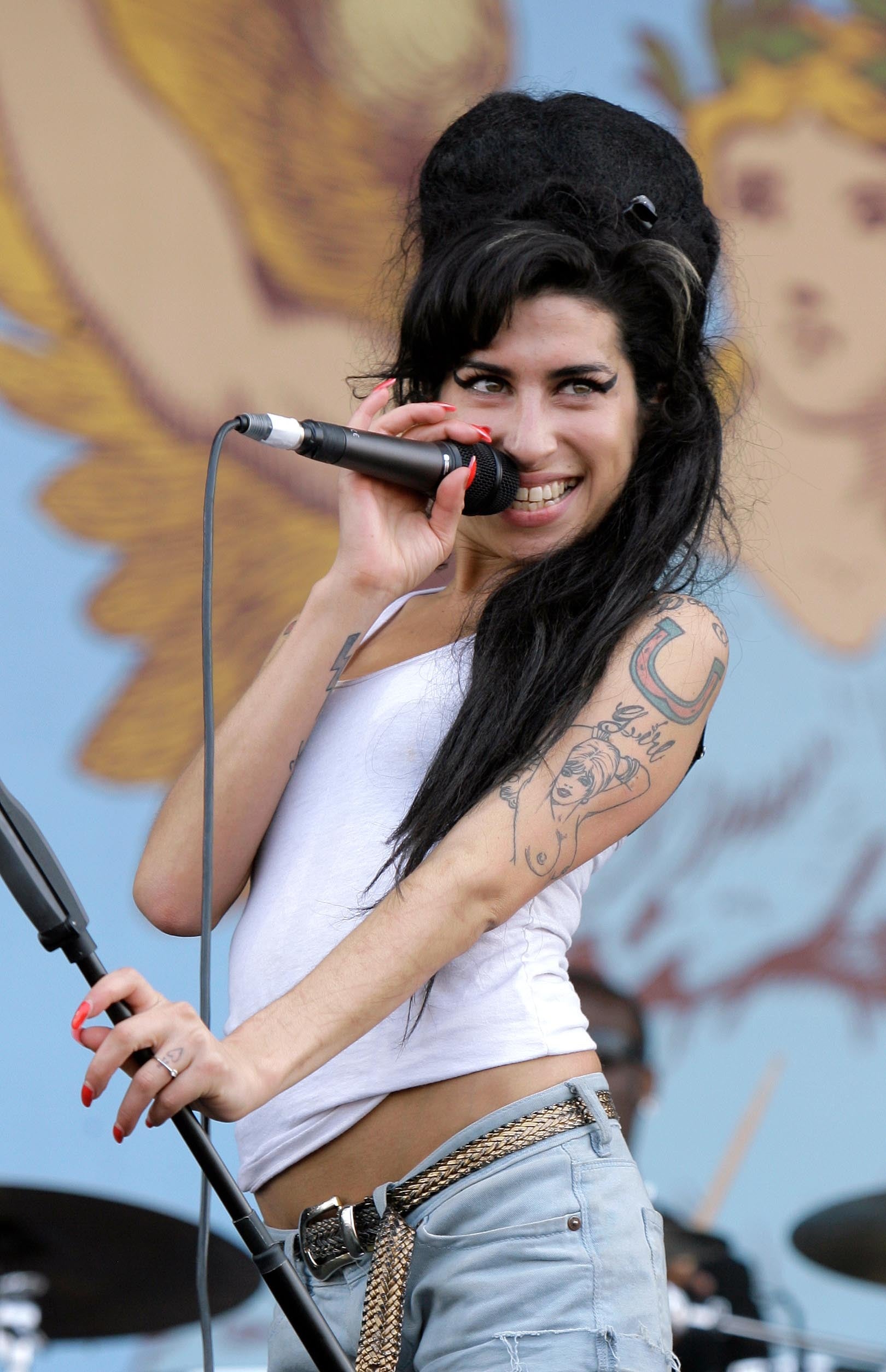 On stage, Winehouse’s trademark look could be summed up as little dresses + big hair. Obsessed with 1950s rockabilly style, the London-born singer favoured form-fitting minidresses, often cinched at the waist with a wide belt.