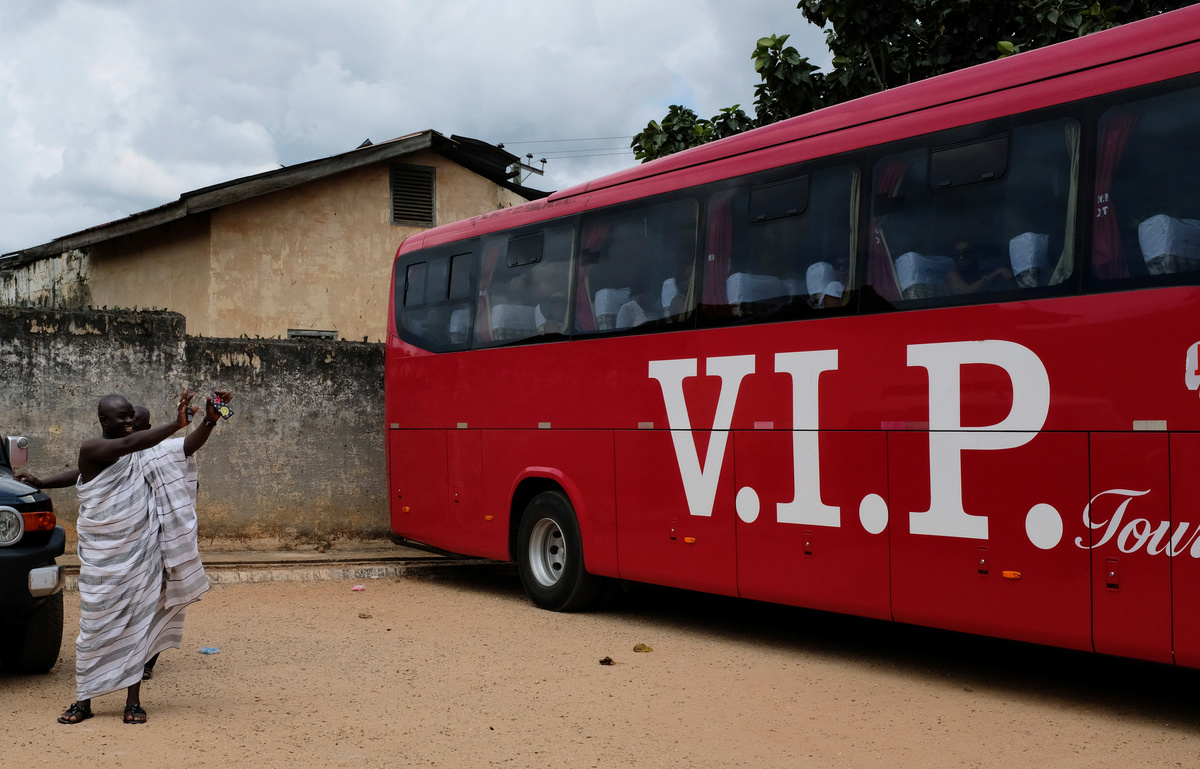The tour involved long bus rides on bumpy roads hedged with tattered banana and palm trees. As they journeyed inland to the Ashanti capital of Kumasi and then back to the slave sites on the coast, they passed shops tacked together out of sheet metal, old boards and tarpaulin offering everyday services with a religious flavor: "Great Miracle, fax and printing," "With God Tailoring" and "Peace Be With You Keycutting." Street vendors weaved through the traffic, selling chilled drinks and snacks from bowls balanced on their heads. In the distance, a vine-draped tropical forest covered the rolling hills of what the passengers were being told was their homeland.