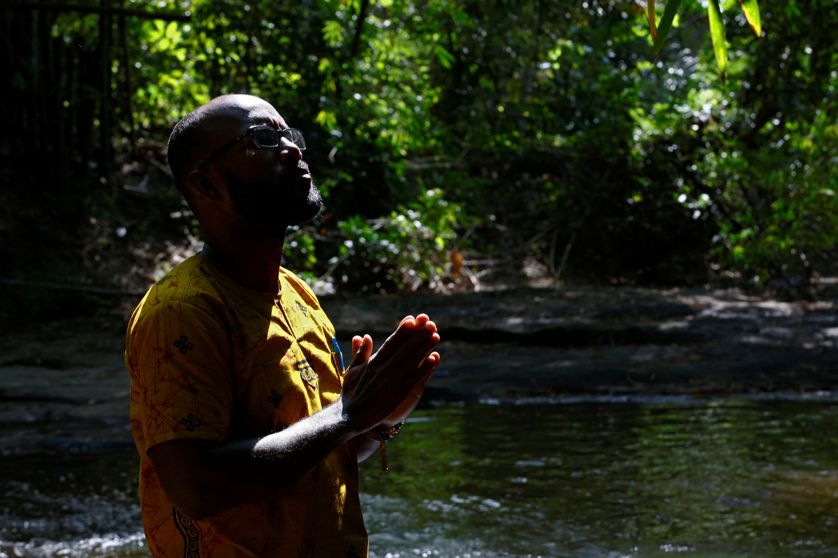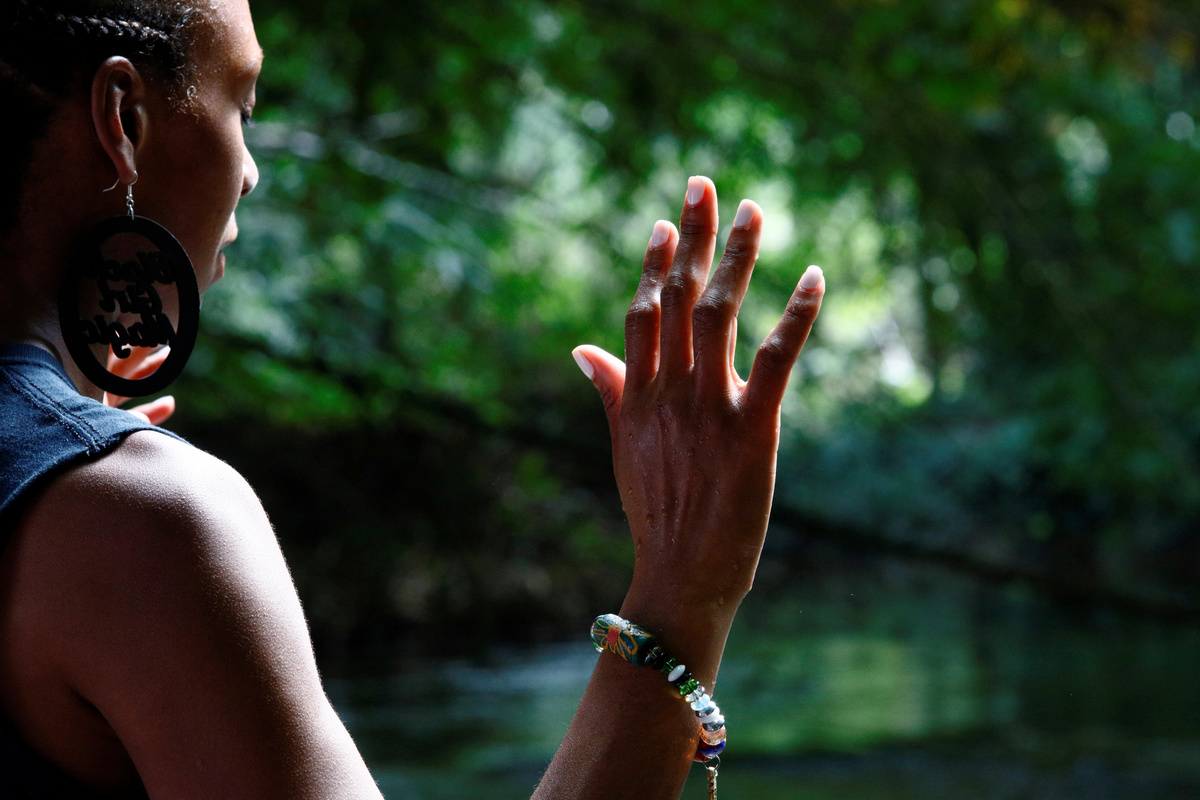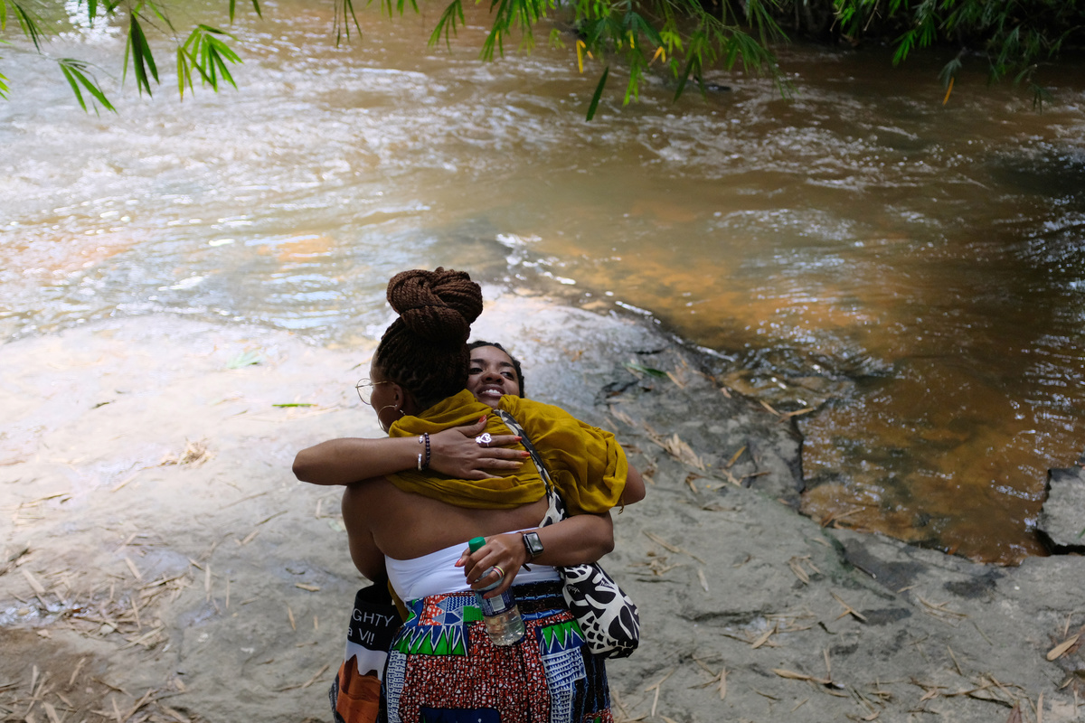They picked their way down the bank past stands of bamboo to the shallow, sun-dappled water, helping the less sure-footed as they went. On the guide's invitation, Sylvester stepped into the creek, closed her eyes and raised her hands in prayer.