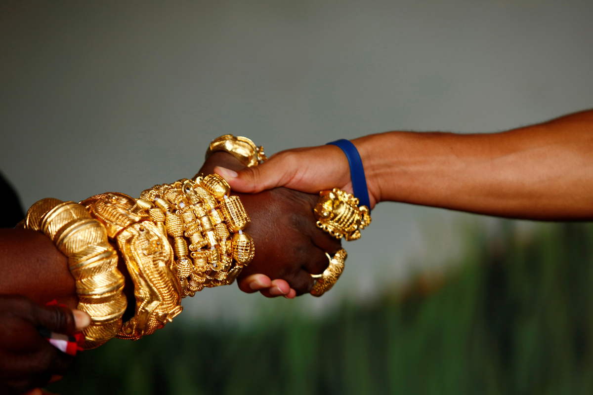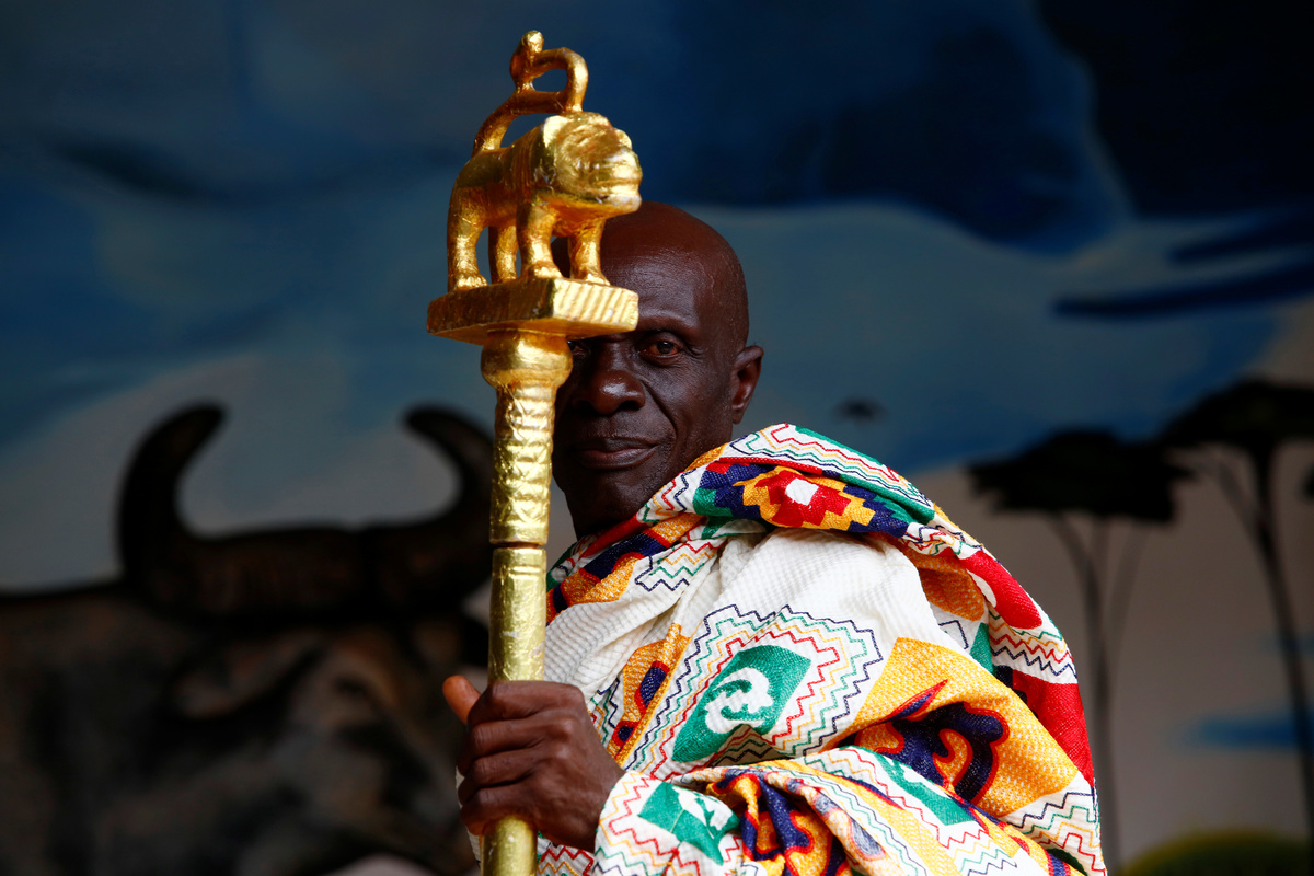 In a small courtyard, musicians in black-and-white robes beat waist-high drums as the chief, his wrist stacked with chunky gold bracelets, performed a ritual dance under a large fringed parasol spun above him by an attendant.