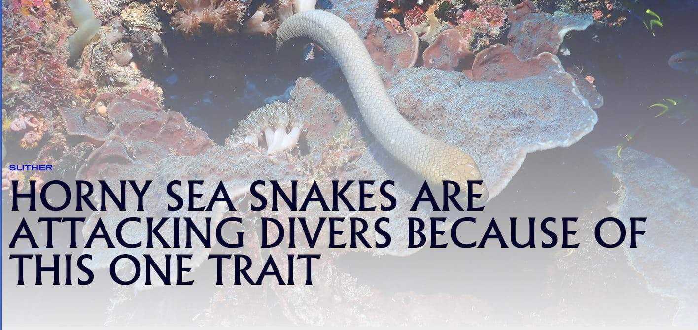 Sea snakes are attacking divers — Jenn Walter has created a dynamic card story that tells the story of the Olive sea snake, which sometimes charges at divers unprompted. But data analysis shows this is likely a misdirected courtship behavior: