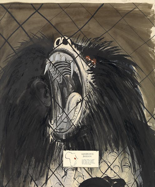 The pain and anguish of the Sacred baboon, locked in its cage, tagged as from far distant Africa, its delicately drawn fingers interlocked into the mesh of its prison, seems frighteningly human.