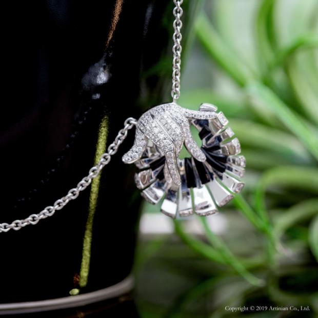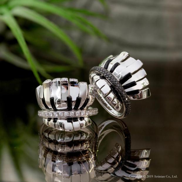 The one-of-a-kind ring, for instance, features onyx set in elevated high polish white gold, and a diamond-micropavé hand whimsically evoking fingering on the keyboard.
