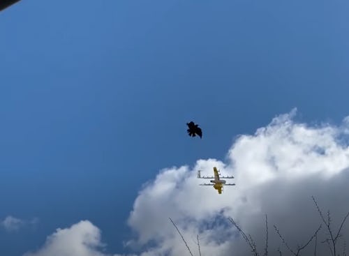 Wing drones are supposed to use software to inform air traffic controllers of their location, so as not to collide with other aircraft. But a 41-second video shows that birds are a more unpredictable obstacle. As the Wing drone captured is trying to land, a black raven repeatedly flies up to it, as if attacking it. The drone doesn’t appear to take any issue with the raven, however, and eventually flies off into the distance.