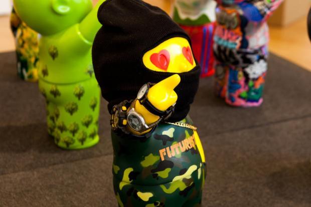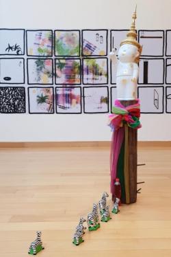 Placed methodically across the Bangkok Art and Culture Centre's (BACC) 8th floor gallery are 200 little figurines of a boy pointing towards the sky. Each decorated, painted and reimagined in different ways by international and Thai artists tells a story of their own. There's one wearing a camo military uniform donning multiple watches, one lying on the floor in a pool of blood, and one on a wooden pedestal -- dressed in a traditional Thai headdress with tiny little zebras lined up on the floor next to it.