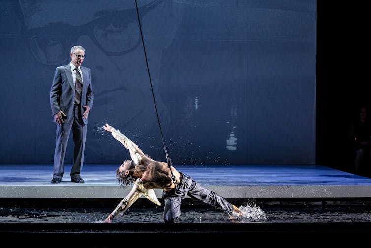 The work opens with dancer (Mason Kelly) in a body harness falling in slow motion from the top of the stage into a pool of water. A kind of solemn horror is evoked, as the last moments of Dr Duncan’s life are evoked in a highly aestheticised way.