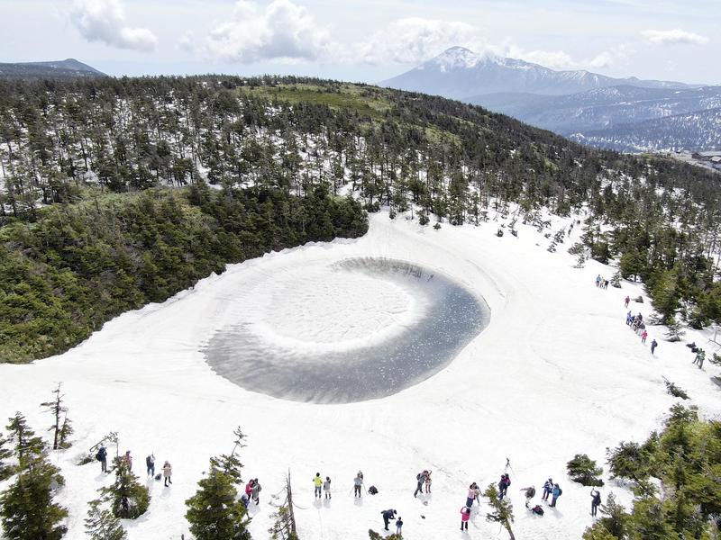 A natural phenomenon called the "Dragon's eye" appears Wednesday at Kagaminuma pond near the top of the 1,613-meter Mt. Hachimantai on the border between Iwate and Akita prefectures. In spring, water from melted snow flows into the pond, which has a diameter of about 50 meters, and remains on the edge. Meanwhile, the snow accumulated near the center remains unmelted, creating a landscape resembling the eye of a dragon. The local tourism association said the phenomenon appears for a limited time in early spring and can be seen until around early June.