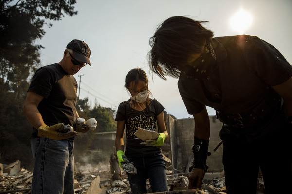 Others stood ankle deep in ashes, the open sky above them where once there was a roof. Shovels in gloved hands, they searched for old spoons, pieces of jewelry, fireplace tools _ talismans of their past.