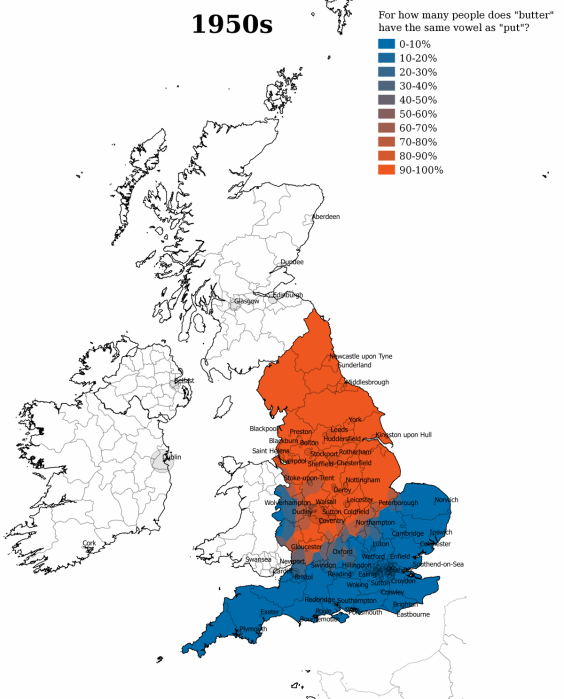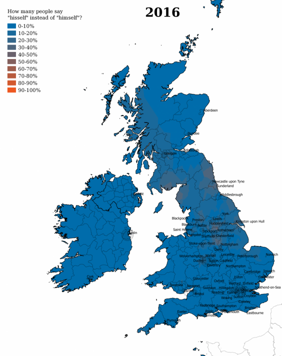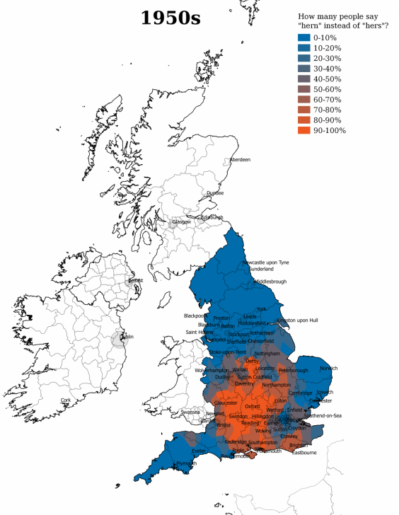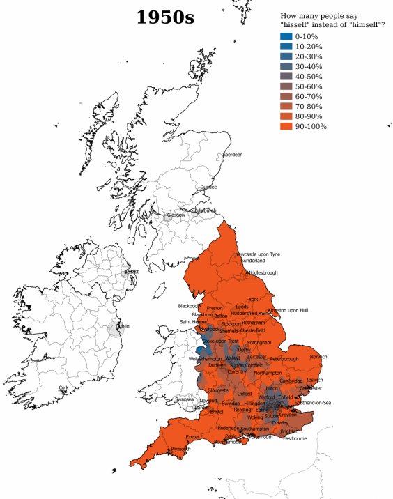 We are also losing some words that used to be common. In the 1950s, “HISSELF” was the dominant term for “himself,” except in London.