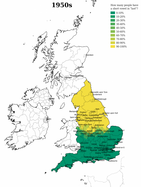 But 60 years ago, if you pronounced the “r” in “ARM” you were almost certainly from the West Country or Newcastle. (It's likely that Scotland and Ireland were big “r” pronouncers too - but we don't have the data for that.)