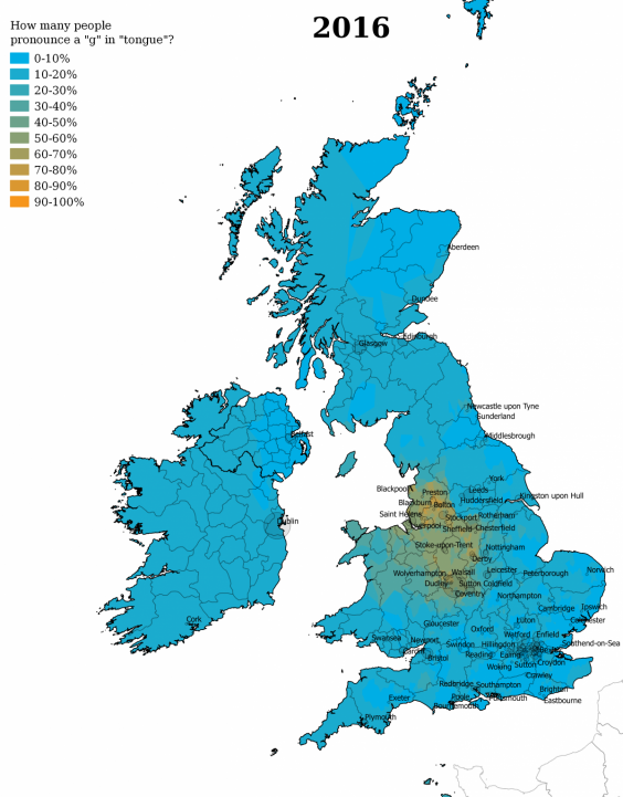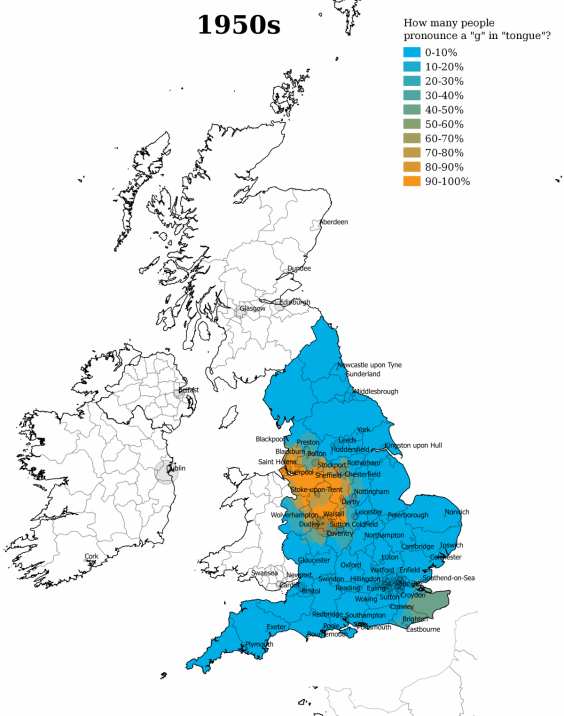 Back in the day, the hard “g” in “TONGUE” was much more common in Stoke and Merseyside.