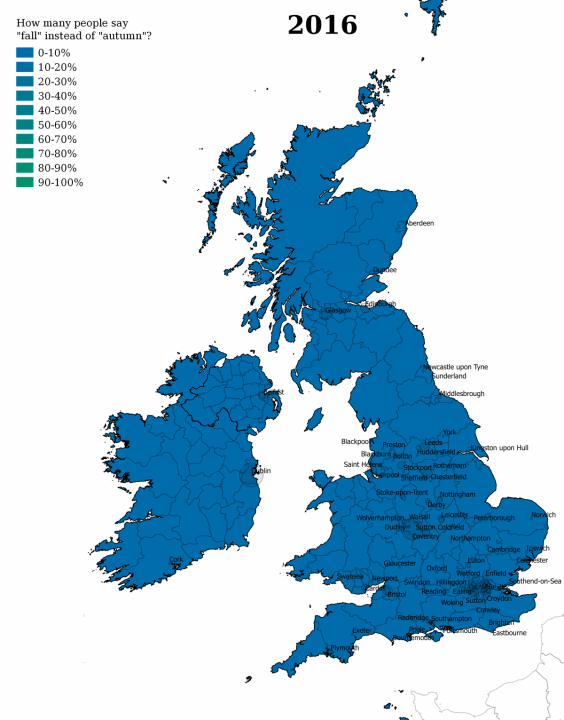 Americans call the October season “FALL.” But no one in Britain says that today. We call it “AUTUMN,” as this map shows. But there is a plot twist coming up ...