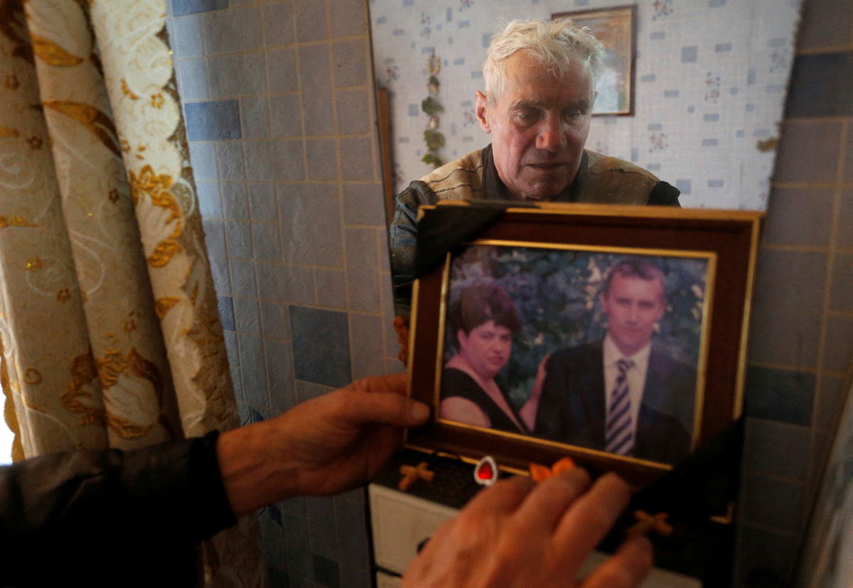 On a table stands a tragic personal memento of the war. A photograph, tied neatly with black ribbons across two corners, shows his son and daughter-in-law, killed by shelling on the same day in January 2015.