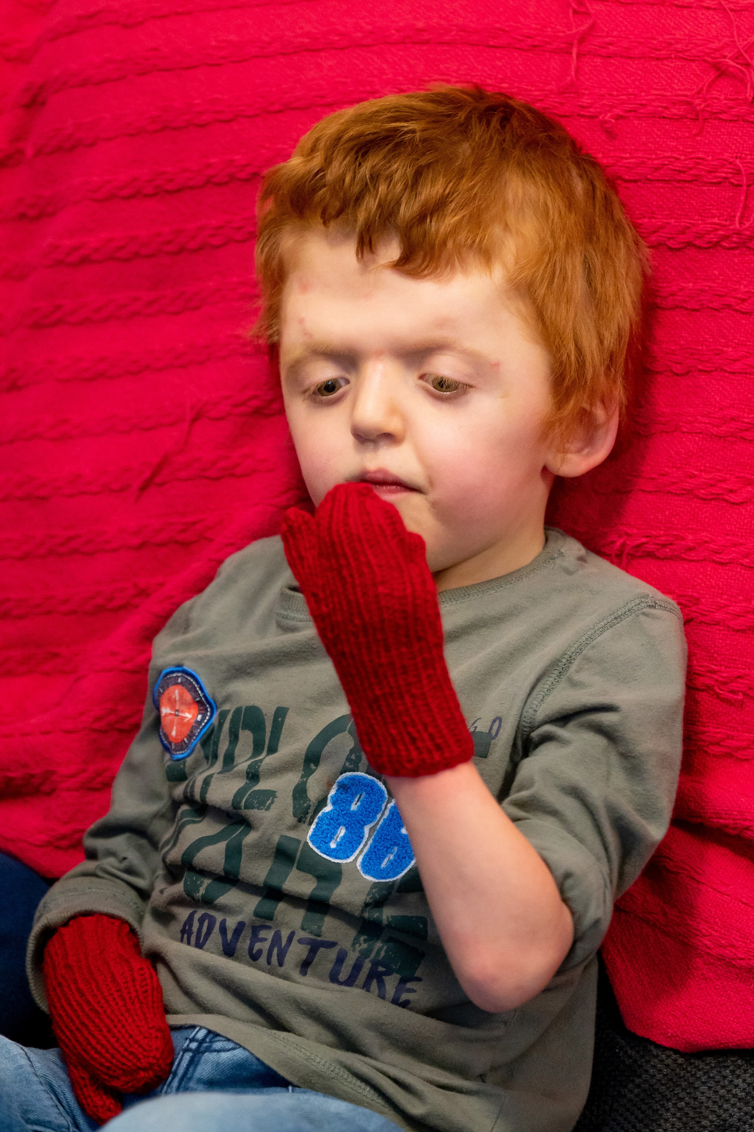 A global online community, called Knit for a Unique Fit, has helped give Deacon his own custom-made hand warmers in his favourite colour; red.