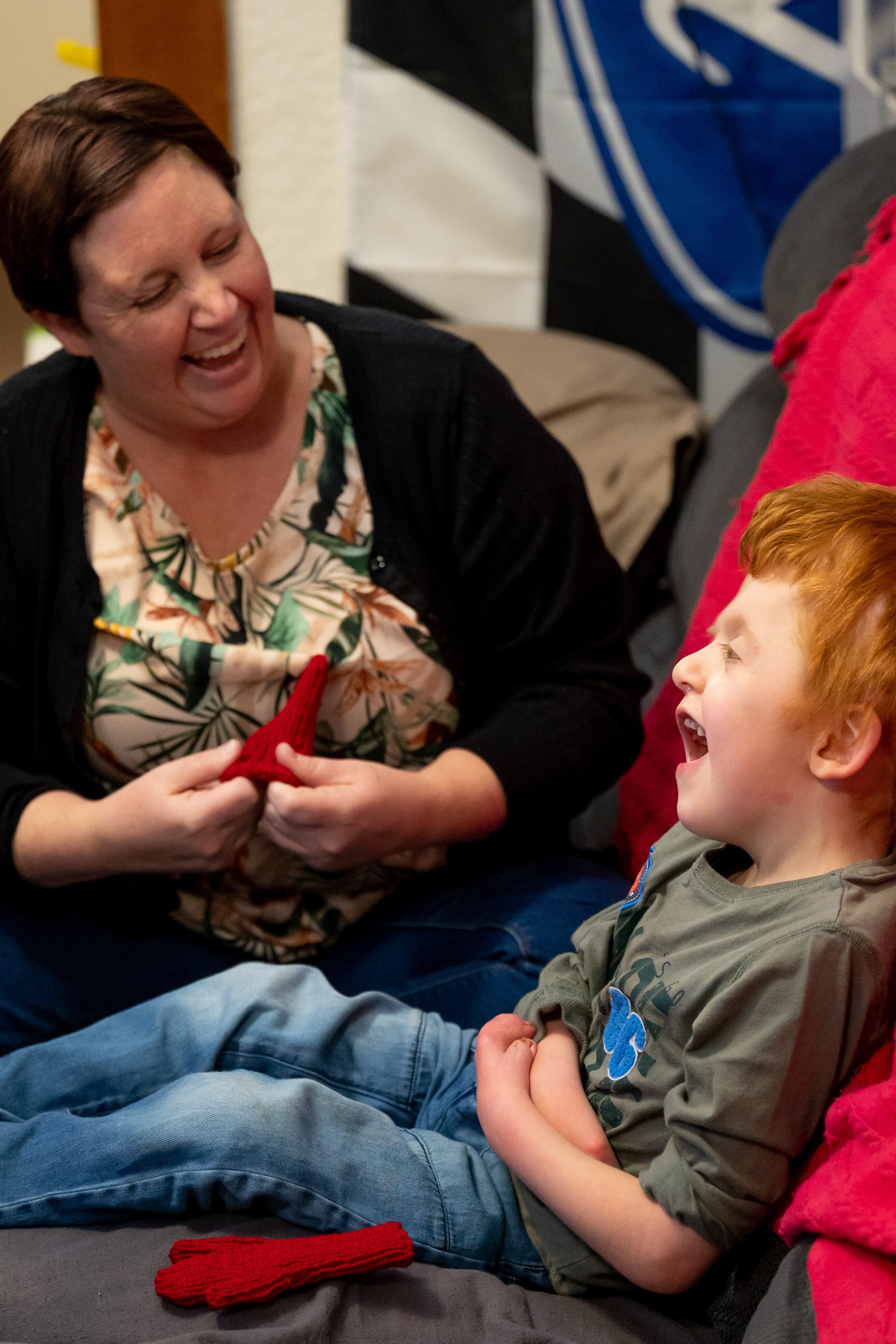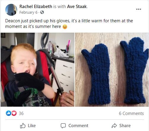 Once Ms Scott traced Deacon's hands, she made the gloves and gifted them to her new little friend.