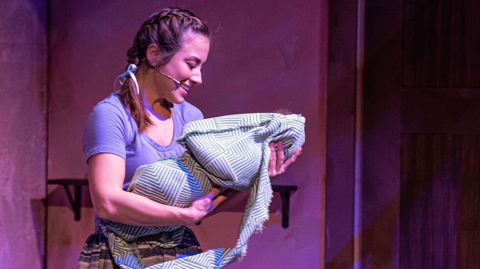 Quijada’s fictionalized version of Reina (appealingly played by operatically trained newcomer Gabriela Moscoso) is dressed in pigtails tied with blue ribbon. Scenic designer Yvonne Miranda provides a circular thrust stage painted with yellow bricks.