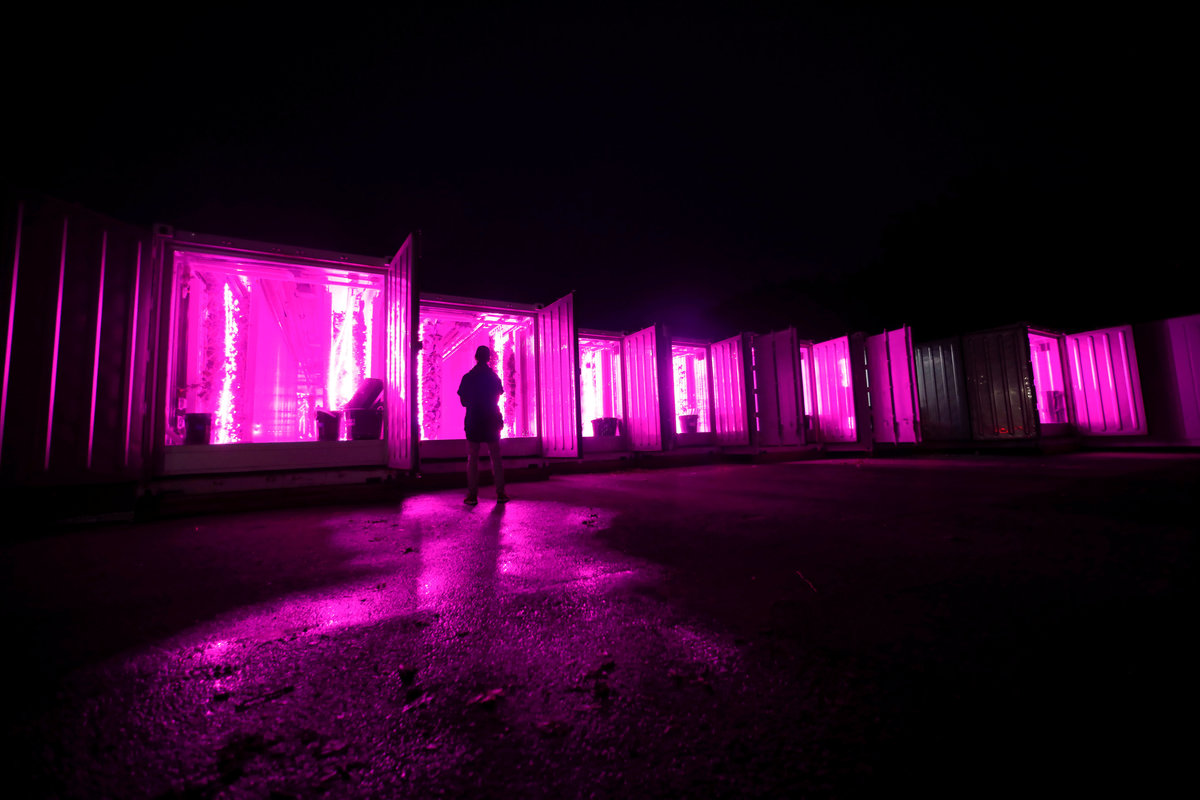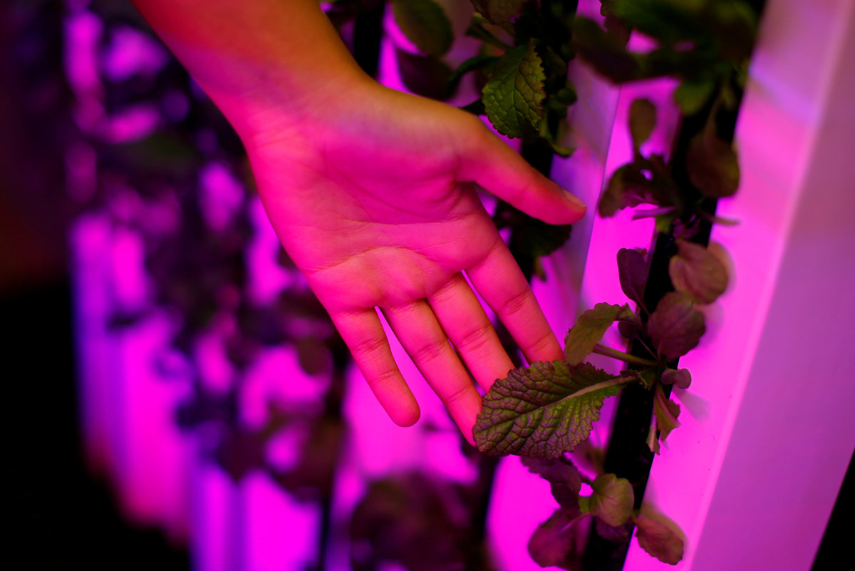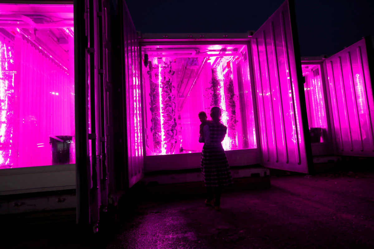 For 12 months, farmers each get a 320-square-foot steel shipping container where they control the climate of their own farm. Under pink LED lights, they grow GMO-free greens all year round.