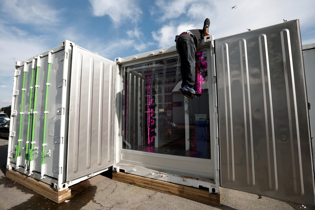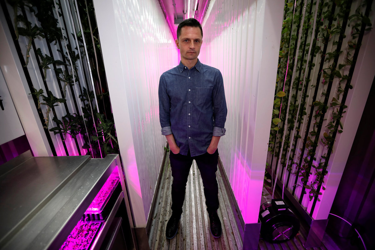 "Square Roots" Co-founder Tobias Peggs poses for a portrait inside one of 10 hydroponic climate controlled farms growing inside repurposed 320-square-foot metal shipping containers where entrepreneur farmers enrolled in the "Square Roots" farming program are growing and selling a variety of greens in the parking lot of a former Pfizer factory in the Brooklyn Borough of New York City, U.S. on May 5, 2017. Picture taken May 5, 2017. REUTERS/Mike Segar