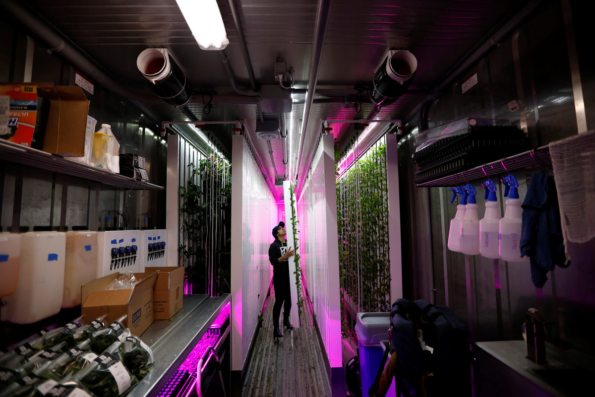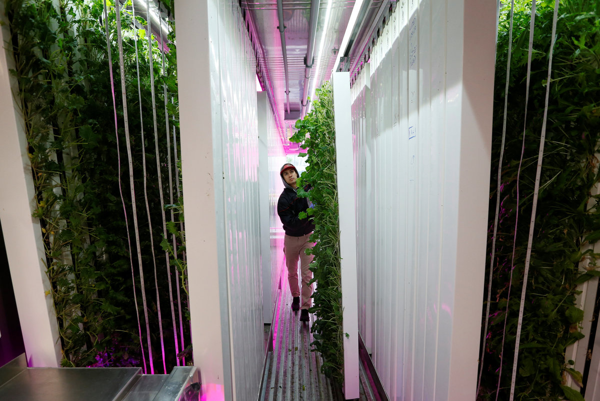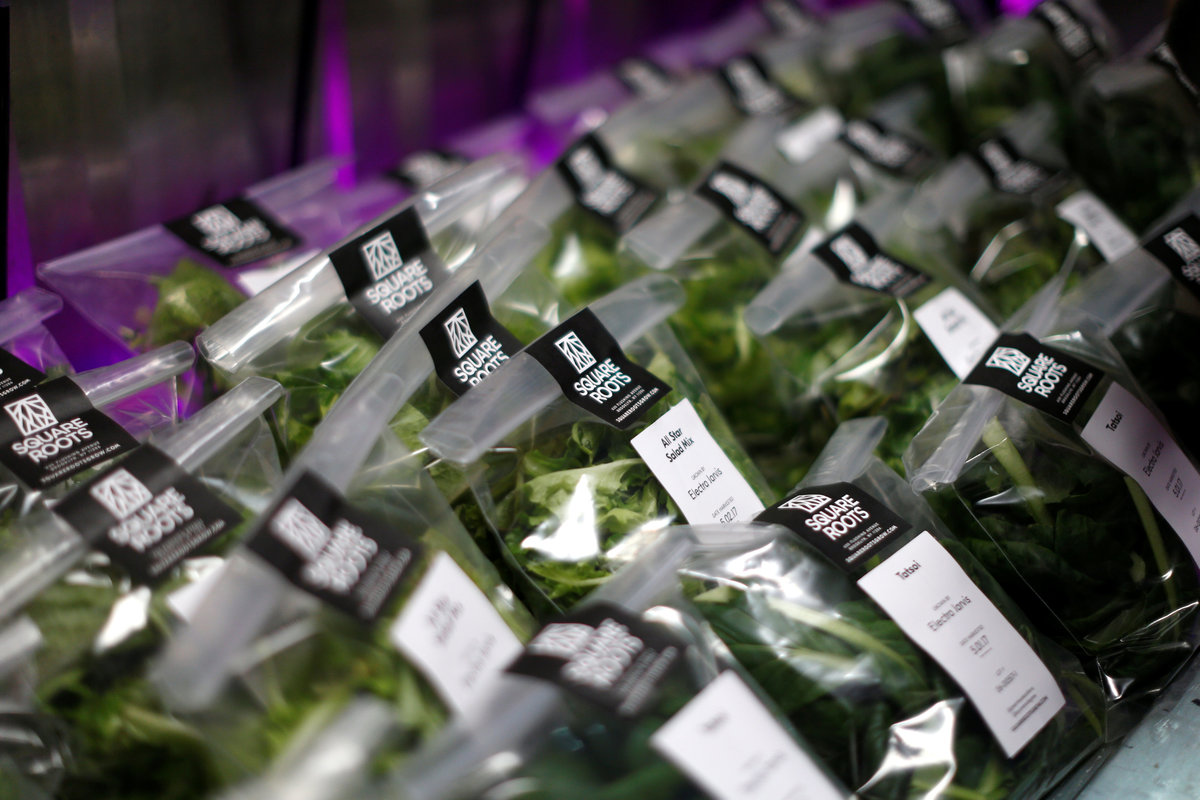 A young girl holds her little brother as she stands where LED lights glow from a cluster of 10 hydroponic climate controlled farms housed in repurposed 320-square-foot metal shipping containers where entrepreneur farmers enrolled in the "Square Roots" farming program are growing and selling a variety of organic greens in the parking lot of a former Pfizer factory in the Brooklyn Borough of New York City, U.S. on May 23, 2017. Picture taken May 23, 2017. REUTERS/Mike SegarA variety of freshly harvested greens grown by Farmer Erik Groszyk are seen packaged for delivery inside his hydroponic climate controlled farm, one of 10 repurposed 320-square-foot metal shipping containers where entrepreneur farmers enrolled in the "Square Roots" farming program are growing and selling greens in the parking lot of a former Pfizer factory in the Brooklyn Borough of New York City, U.S. on May 5, 2017. Picture taken May 5, 2017. REUTERS/Mike SegarFarmer Nabeela Lakhani inspects Red Giant mustard greens growing inside her hydroponic climate controlled farm, one of 10 repurposed 320-square-foot metal shipping containers where entrepreneur farmers enrolled in the "Square Roots" farming program are growing and selling a variety of greens in the parking lot of a former Pfizer factory in the Brooklyn Borough of New York City, U.S. on May 5, 2017. Picture taken May 5, 2017. REUTERS/Mike SegarFarmer Paul Philpott climbs on top of his hydroponic climate controlled farm, one of 10 repurposed 320-square-foot metal shipping containers where entrepreneur farmers enrolled in the "Square Roots" farming program are growing and selling a variety of greens in the parking lot of a former Pfizer factory in the Brooklyn Borough of New York City, U.S. on May 10, 2017. Picture taken May 10, 2017. REUTERS/Mike SegarFarmer Nabeela Lakhani delivers packaged mustard greens to the Chalk Point Kitchen restaurant, one of her delivery clients in Manhattan, that were grown inside her hydroponic climate controlled farm, one of 10 repurposed 320-square-foot metal shipping containers where entrepreneur farmers enrolled in the "Square Roots" farming program are growing and selling a variety of greens in the parking lot of a former Pfizer factory in the Brooklyn Borough of New York City, U.S. on May 5, 2017. Picture taken May 5, 2017. REUTERS/Mike SegarFarmer Erik Groszyk works inside his hydroponic climate controlled farm, one of 10 repurposed 320-square-foot metal shipping containers where entrepreneur farmers enrolled in the "Square Roots" farming program are growing and selling a variety of greens in the parking lot of a former Pfizer factory in the Brooklyn Borough of New York City, U.S. on May 5, 2017. Picture taken May 5, 2017. REUTERS/Mike SegarFarmer Erik Groszyk holds a tray mustard green seedlings for transplanting that are growing inside his hydroponic climate controlled farm, one of 10 repurposed 320-square-foot metal shipping containers where entrepreneur farmers enrolled in the "Square Roots" farming program are growing and selling a variety of greens in the parking lot of a former Pfizer factory in the Brooklyn Borough of New York City, U.S. on May 5, 2017. Picture taken May 5, 2017. REUTERS/Mike SegarFarmers enrolled in the "Square Roots" farming program relax in the program's offices near where their hydroponic climate controlled farms, housed in 10 repurposed 320-square-foot metal shipping containers are growing and selling a variety of greens in the parking lot of a former Pfizer factory in the Brooklyn Borough of New York City, U.S. on May 10, 2017. Picture taken May 10, 2017. REUTERS/Mike SegarFarmer Erik Groszyk stands in the glow of LED lights emanating from a cluster of 10 hydroponic climate controlled farms housed in repurposed 320-square-foot metal shipping containers where he and nine other entrepreneur farmers enrolled in the "Square Roots" farming program are growing and selling a variety of organic greens in the parking lot of a former Pfizer factory in the Brooklyn Borough of New York City, U.S., on May 23, 2017. Picture taken May 5, 2017. REUTERS/Mike SegarFarmer Sylvia Channing (R) speaks to customers at a farmers market where customers were sampling and buying greens grown inside one of 10 hydroponic climate controlled farms in repurposed 320-square-foot metal shipping containers where entrepreneur farmers enrolled in the "Square Roots" farming program are growing and selling a variety of greens in the parking lot of a former Pfizer factory in the Brooklyn Borough of New York City, U.S. on May 5, 2017. Picture taken May 23, 2017. REUTERS/Mike SegarFarmer Nabeela Lakhani carries a bag of packaged greens for delivery through the subway that were grown inside her hydroponic climate controlled farm, one of 10 repurposed 320-square-foot metal shipping containers where entrepreneur farmers enrolled in the "Square Roots" farming program are growing and selling a variety of greens in the parking lot of a former Pfizer factory in the Brooklyn Borough of New York City, U.S. on May 5, 2017. Picture taken May 5, 2017. REUTERS/Mike SegarFarmer Nabeela Lakhani works on racks of greens growing inside her hydroponic climate controlled farm, one of 10 repurposed 320-square-foot metal shipping containers where entrepreneur farmers enrolled in the "Square Roots" farming program are growing and selling a variety of greens in the parking lot of a former Pfizer factory in the Brooklyn Borough of New York City, U.S., on May 5, 2017. Picture taken May 5, 2017. REUTERS/Mike Segar