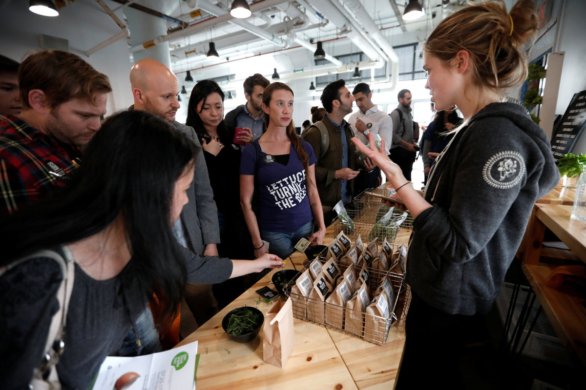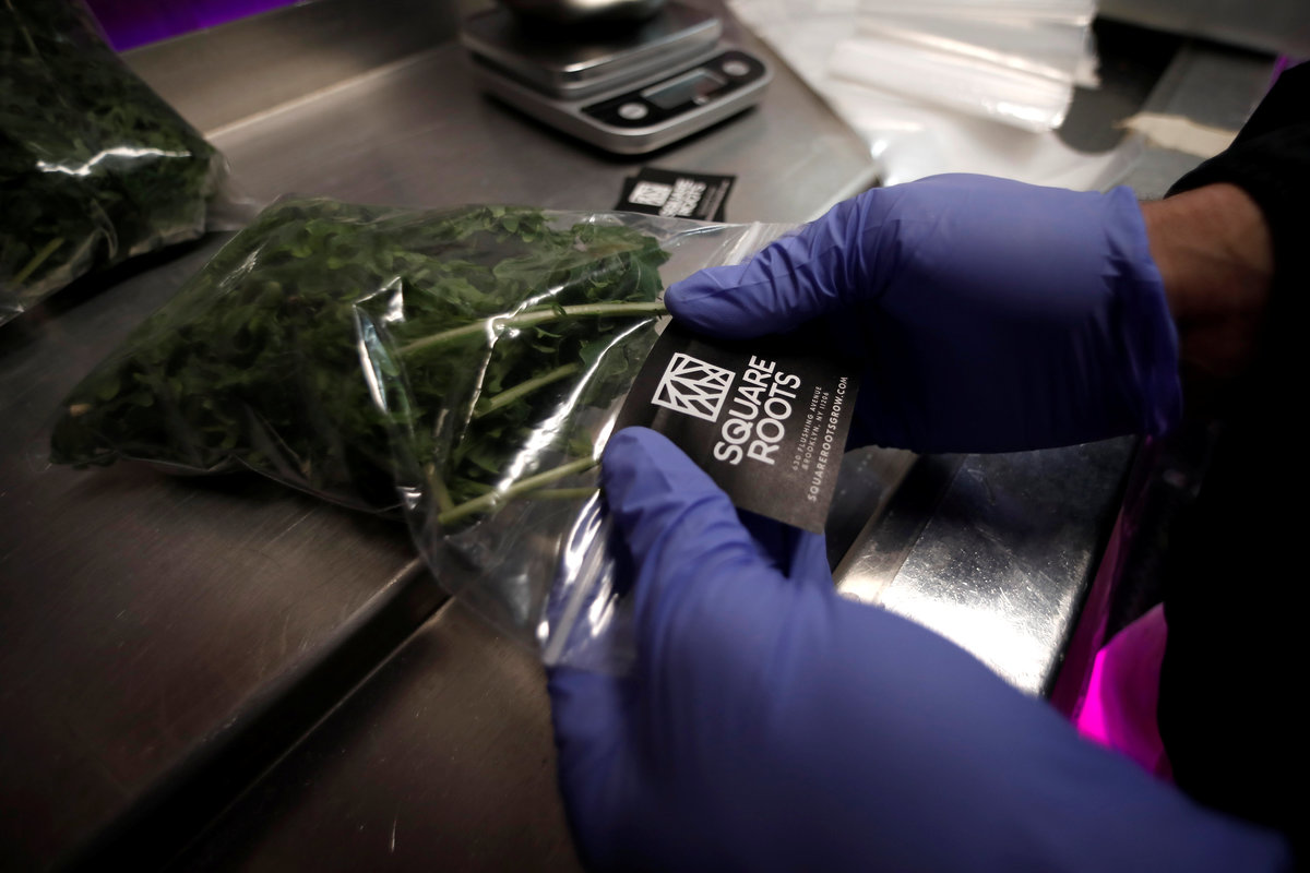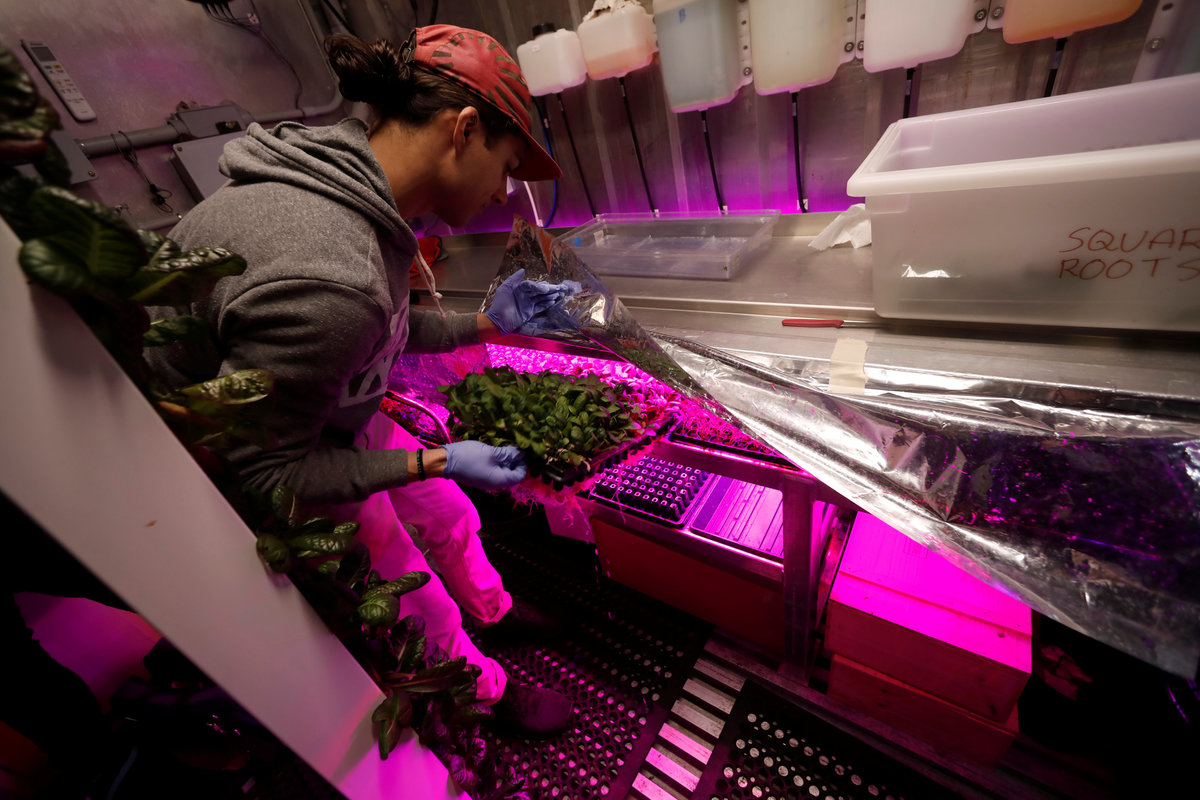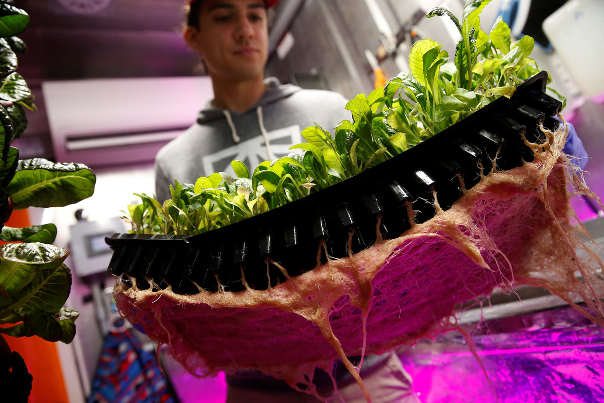 A young girl holds her little brother as she stands where LED lights glow from a cluster of 10 hydroponic climate controlled farms housed in repurposed 320-square-foot metal shipping containers where entrepreneur farmers enrolled in the "Square Roots" farming program are growing and selling a variety of organic greens in the parking lot of a former Pfizer factory in the Brooklyn Borough of New York City, U.S. on May 23, 2017. Picture taken May 23, 2017. REUTERS/Mike SegarA variety of freshly harvested greens grown by Farmer Erik Groszyk are seen packaged for delivery inside his hydroponic climate controlled farm, one of 10 repurposed 320-square-foot metal shipping containers where entrepreneur farmers enrolled in the "Square Roots" farming program are growing and selling greens in the parking lot of a former Pfizer factory in the Brooklyn Borough of New York City, U.S. on May 5, 2017. Picture taken May 5, 2017. REUTERS/Mike SegarFarmer Nabeela Lakhani inspects Red Giant mustard greens growing inside her hydroponic climate controlled farm, one of 10 repurposed 320-square-foot metal shipping containers where entrepreneur farmers enrolled in the "Square Roots" farming program are growing and selling a variety of greens in the parking lot of a former Pfizer factory in the Brooklyn Borough of New York City, U.S. on May 5, 2017. Picture taken May 5, 2017. REUTERS/Mike SegarFarmer Paul Philpott climbs on top of his hydroponic climate controlled farm, one of 10 repurposed 320-square-foot metal shipping containers where entrepreneur farmers enrolled in the "Square Roots" farming program are growing and selling a variety of greens in the parking lot of a former Pfizer factory in the Brooklyn Borough of New York City, U.S. on May 10, 2017. Picture taken May 10, 2017. REUTERS/Mike SegarFarmer Nabeela Lakhani delivers packaged mustard greens to the Chalk Point Kitchen restaurant, one of her delivery clients in Manhattan, that were grown inside her hydroponic climate controlled farm, one of 10 repurposed 320-square-foot metal shipping containers where entrepreneur farmers enrolled in the "Square Roots" farming program are growing and selling a variety of greens in the parking lot of a former Pfizer factory in the Brooklyn Borough of New York City, U.S. on May 5, 2017. Picture taken May 5, 2017. REUTERS/Mike SegarFarmer Erik Groszyk works inside his hydroponic climate controlled farm, one of 10 repurposed 320-square-foot metal shipping containers where entrepreneur farmers enrolled in the "Square Roots" farming program are growing and selling a variety of greens in the parking lot of a former Pfizer factory in the Brooklyn Borough of New York City, U.S. on May 5, 2017. Picture taken May 5, 2017. REUTERS/Mike SegarFarmer Erik Groszyk holds a tray mustard green seedlings for transplanting that are growing inside his hydroponic climate controlled farm, one of 10 repurposed 320-square-foot metal shipping containers where entrepreneur farmers enrolled in the "Square Roots" farming program are growing and selling a variety of greens in the parking lot of a former Pfizer factory in the Brooklyn Borough of New York City, U.S. on May 5, 2017. Picture taken May 5, 2017. REUTERS/Mike SegarFarmers enrolled in the "Square Roots" farming program relax in the program's offices near where their hydroponic climate controlled farms, housed in 10 repurposed 320-square-foot metal shipping containers are growing and selling a variety of greens in the parking lot of a former Pfizer factory in the Brooklyn Borough of New York City, U.S. on May 10, 2017. Picture taken May 10, 2017. REUTERS/Mike SegarFarmer Erik Groszyk stands in the glow of LED lights emanating from a cluster of 10 hydroponic climate controlled farms housed in repurposed 320-square-foot metal shipping containers where he and nine other entrepreneur farmers enrolled in the "Square Roots" farming program are growing and selling a variety of organic greens in the parking lot of a former Pfizer factory in the Brooklyn Borough of New York City, U.S., on May 23, 2017. Picture taken May 5, 2017. REUTERS/Mike SegarFarmer Sylvia Channing (R) speaks to customers at a farmers market where customers were sampling and buying greens grown inside one of 10 hydroponic climate controlled farms in repurposed 320-square-foot metal shipping containers where entrepreneur farmers enrolled in the "Square Roots" farming program are growing and selling a variety of greens in the parking lot of a former Pfizer factory in the Brooklyn Borough of New York City, U.S. on May 5, 2017. Picture taken May 23, 2017. REUTERS/Mike SegarFarmer Nabeela Lakhani carries a bag of packaged greens for delivery through the subway that were grown inside her hydroponic climate controlled farm, one of 10 repurposed 320-square-foot metal shipping containers where entrepreneur farmers enrolled in the "Square Roots" farming program are growing and selling a variety of greens in the parking lot of a former Pfizer factory in the Brooklyn Borough of New York City, U.S. on May 5, 2017. Picture taken May 5, 2017. REUTERS/Mike SegarFarmer Nabeela Lakhani works on racks of greens growing inside her hydroponic climate controlled farm, one of 10 repurposed 320-square-foot metal shipping containers where entrepreneur farmers enrolled in the "Square Roots" farming program are growing and selling a variety of greens in the parking lot of a former Pfizer factory in the Brooklyn Borough of New York City, U.S., on May 5, 2017. Picture taken May 5, 2017. REUTERS/Mike Segar