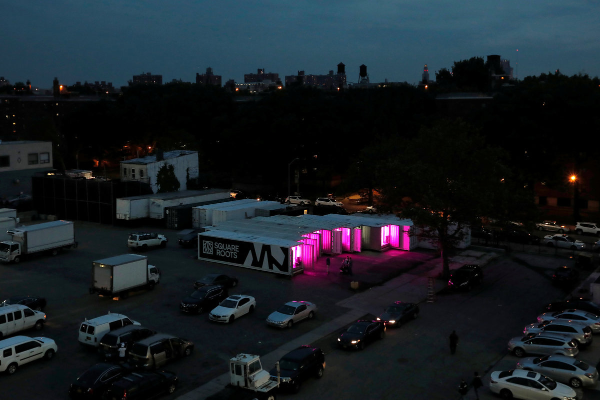 LED lights glow from a cluster of 10 hydroponic climate controlled farms housed in repurposed 320-square-foot metal shipping containers where entrepreneur farmers enrolled in the "Square Roots" farming program are growing and selling a variety of organic greens in the parking lot of a former Pfizer factory in the Brooklyn Borough of New York City, U.S. on May 23, 2017. Picture taken May 23, 2017. REUTERS/Mike Segar