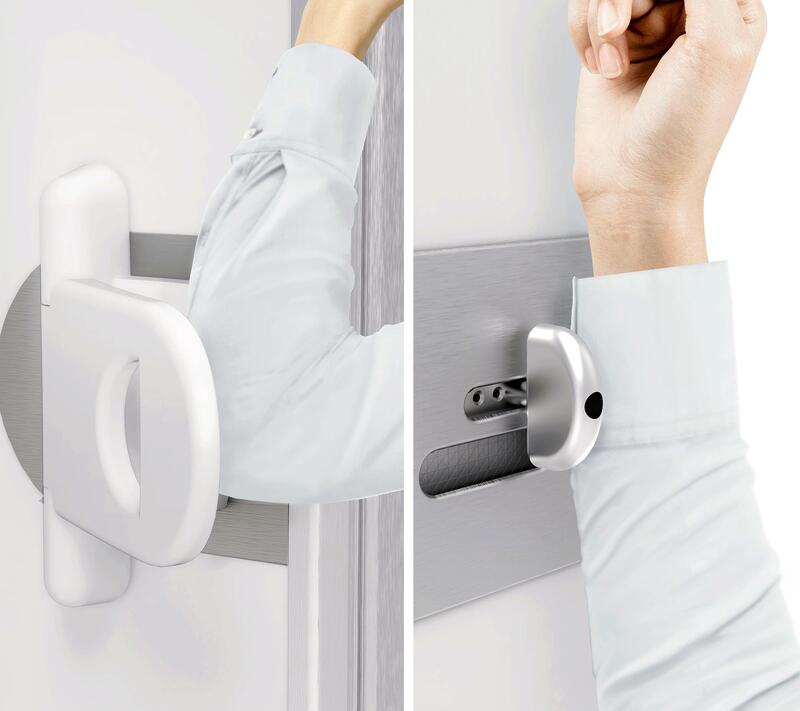 The size of metal devices to lock the doors have also been changed to that of an adult fist, so that users can lock and unlock the doors by sliding the device with their elbow.