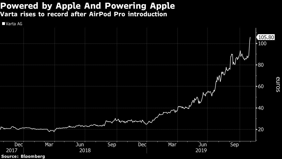 Varta shares have risen to the highest since being re-listed in 2017 on speculation that Apple, the market leader for wireless earbud headphones, may be behind numerous capacity increases announced by the German manufacturer. To date, neither company has confirmed the relationship.