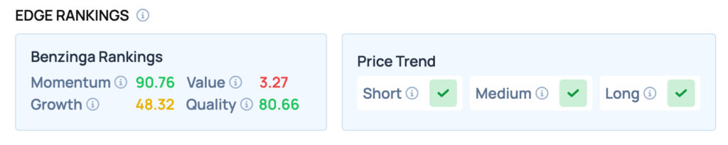 Tesla scores well on Momentum and Quality metrics, while offering satisfactory Growth, but poor Value. Tesla also has a favorable price trend in the Short, Medium and Long term. For more such insights, sign up for Benzinga Edge Stock Rankings today!