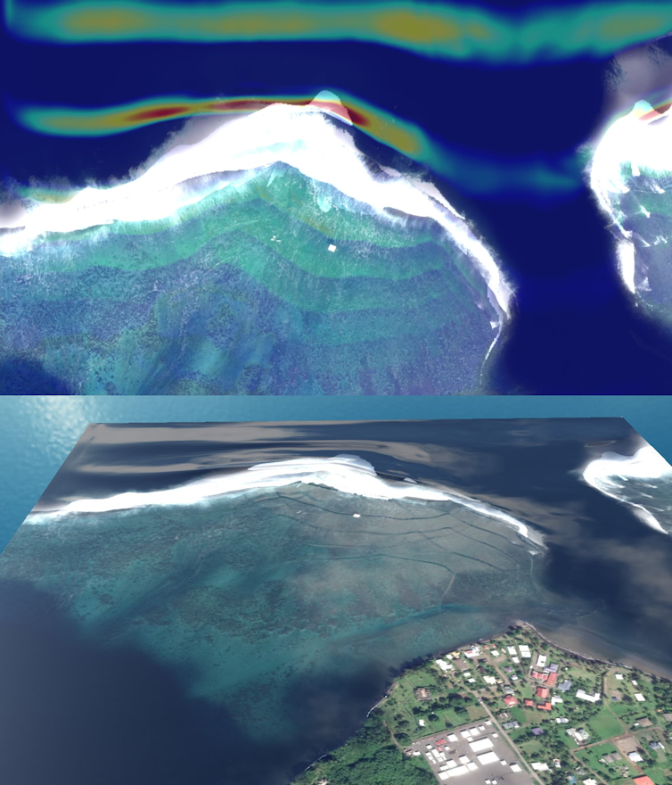New-generation wave models that simulate individual waves, rather than just average energy density, provide insight into what creates a surf break such as Teahupo'o (see figure below). These models provide insight into what happens as waves shoal and refract (bend and focus) over the seabed as they approach break point.