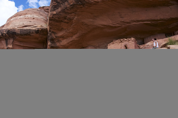 The Anasazi built small villages in the alcoves of canyon walls, now called "cliff dwellings." Moon House is unique in Southwest archaeology because it has a masonry facade, behind which stand a number of rooms. Some of them are decorated with pictographs, such as the one with a partial moon giving the place its name. The enormous size and well-preserved condition of Moon House make it a national treasure. When I got my permit to see Moon House, a BLM ranger asked me not to enter the rooms, which he said contained electronic sensors to alert authorities.