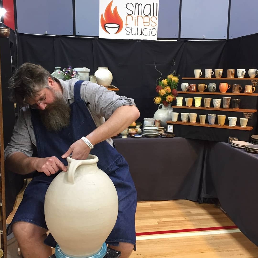 In his Hobart studio, potter Isaac Patmore focuses on small items such as vases, plates, and cups.