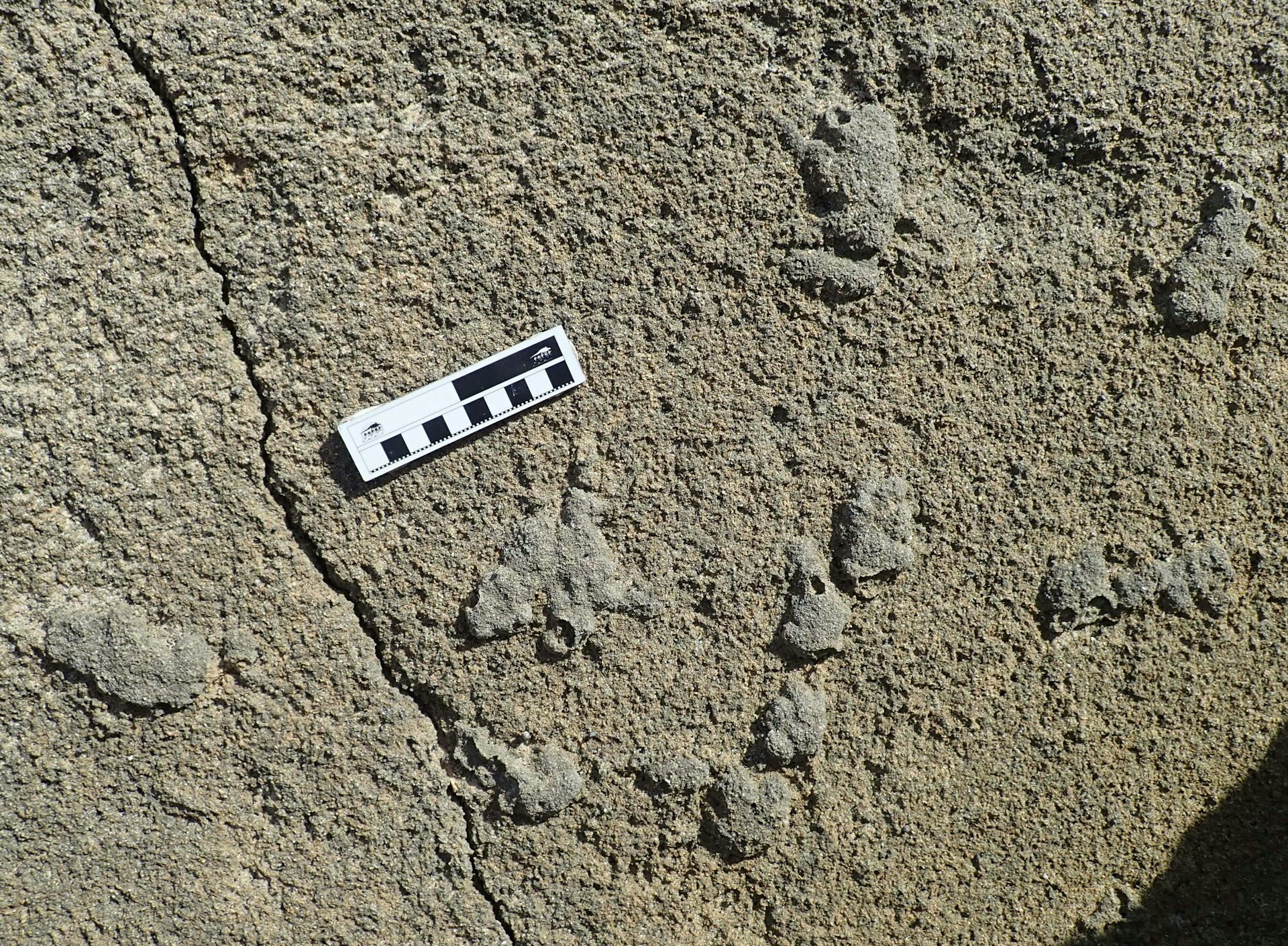Remarkably, close by we found a second site, but with very different characteristics. In this case we noted about 50 small tracks on a rock surface, on which were plastered about 30 raised features, many of which were cylindrical and hollow (characteristic features of some coprolites). In the low cliffs immediately above this surface we found similar coprolites in six layers in a vertical height of 2.6cm.