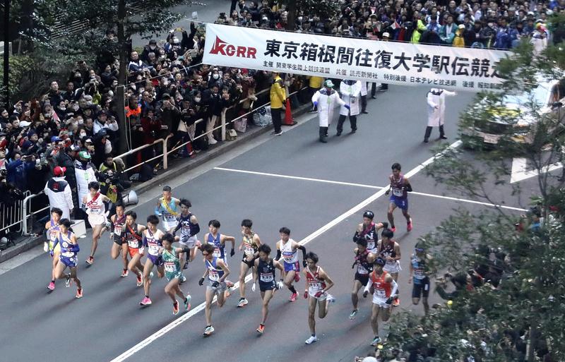 Runners begin the first leg of the Tokyo-Hakone Intercollegiate Ekiden in front of the Yomiuri Shimbun's head office in Chiyoda Ward, Tokyo, on Thursday. Aoyama Gakuin University won in the first half of the prestigious two-day college road relay, which travels from Tokyo to Hakone, Kanagawa Prefecture, and back again for a total of 217.1 kilometers.