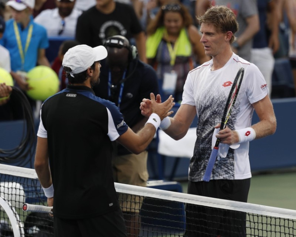 Aug 29, 2018; New York, NY, USA; Kevin Anderson of South Africa (right) greets Jeremy Chardy of France after a second round match on day three of the 2018 U.S. Open tennis tournament at USTA Billie Jean King National Tennis Center. Mandatory Credit: Jerry Lai-USA TODAY Sports