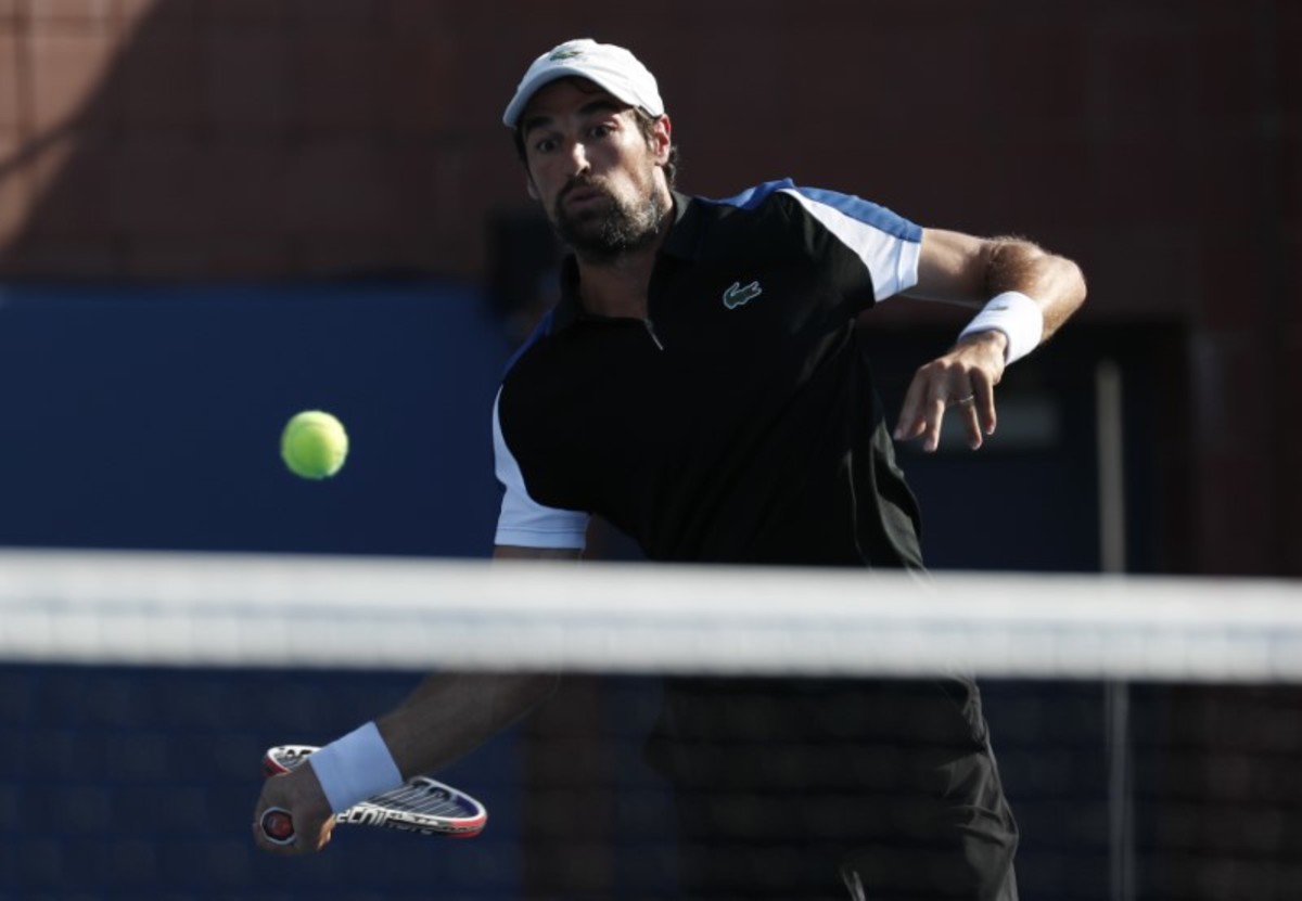Aug 29, 2018; New York, NY, USA; Jeremy Chardy of France hits to Kevin Anderson of South Africa in a second round match on day three of the 2018 U.S. Open tennis tournament at USTA Billie Jean King National Tennis Center. Mandatory Credit: Jerry Lai-USA TODAY Sports