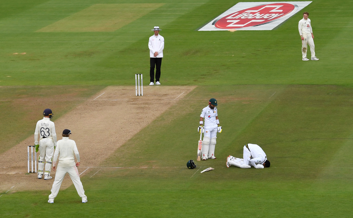 Stuart Broad claimed his first wicket of the test when he had Yasir Shah caught by Joe Root at second slip on 20 and struck again to dismiss Shaheen Shah Afridi for three, with Buttler taking another spectacular catch behind the stumps.