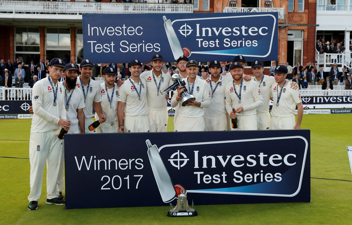 Cricket - England vs West Indies - Third Test - London, Britain - September 9, 2017 England's Joe Root and team mates celebrate with the trophy after winning the Investec Test Series Action Images via Reuters/Andrew Boyers