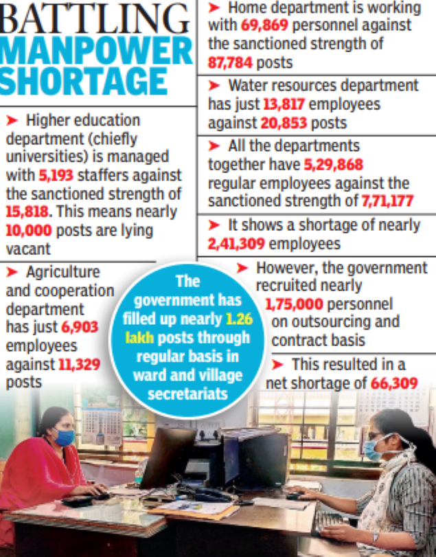 AMARAVATI: Many government departments are struggling with severe shortage of manpower as successive governments have failed to fill the vacancies. School education department is facing severe faculty crunch as about 50,000 teacher posts are lying vacant for the past several years.