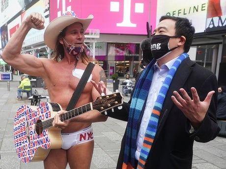 The moment was chronicled by City & State NY reporter Jeff Coltin on Twitter, who says he told Mr Yang that the Naked Cowboy, who approached the candidate in Times Squares, was at the Capitol rally.