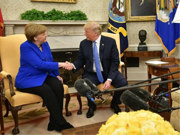 The German chancellor’s trip to Washington included none of the pomp and circumstance afforded to Mr Macron earlier this week, who was the honored guest for the first state dinner of the Trump presidency. The two did embrace when Ms Merkel arrived