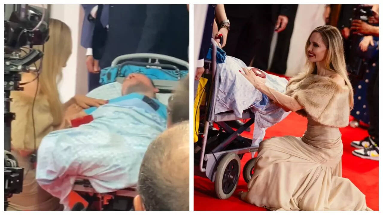 Jolie, who was walking the carpet, surprised all when she knelt down in her champagne-hued gown while meeting a bed-ridden fan. The actress was seen greeting the man and holding his hand as they exchanged some kind words.