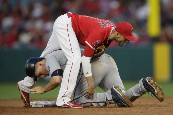 Twins rookie left-hander Adalberto Mejia was making his sixth career start. He began by walking Simmons on four pitches. Simmons took second when Kole Calhoun grounded out and third when Mejia balked. After Pujols struck out, Yunel Escobar rapped a ball bound for right field, but second baseman Brian Dozier slid to prevent it from doing so and threw to first for an out.