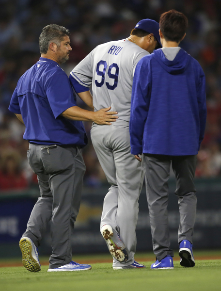 Ryu worked around a two-out single in the fifth, then surrendered a ground-rule double to Calhoun to begin the sixth before Simmons' strike. He then gave up two singles, which ended his outing. Facing left-hander Grant Dayton with the bases loaded, Revere stroked a line drive to the warning track, where Yasiel Puig tracked it down.