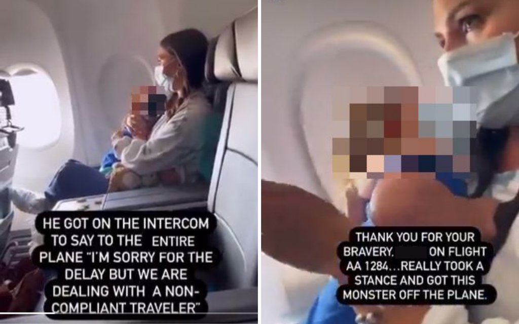 “Thank you for your bravery,” she wrote sarcastically on her Instagram story, adding that the member of the flight crew “really took a stance and got this monster off the plane,” referring to her son.